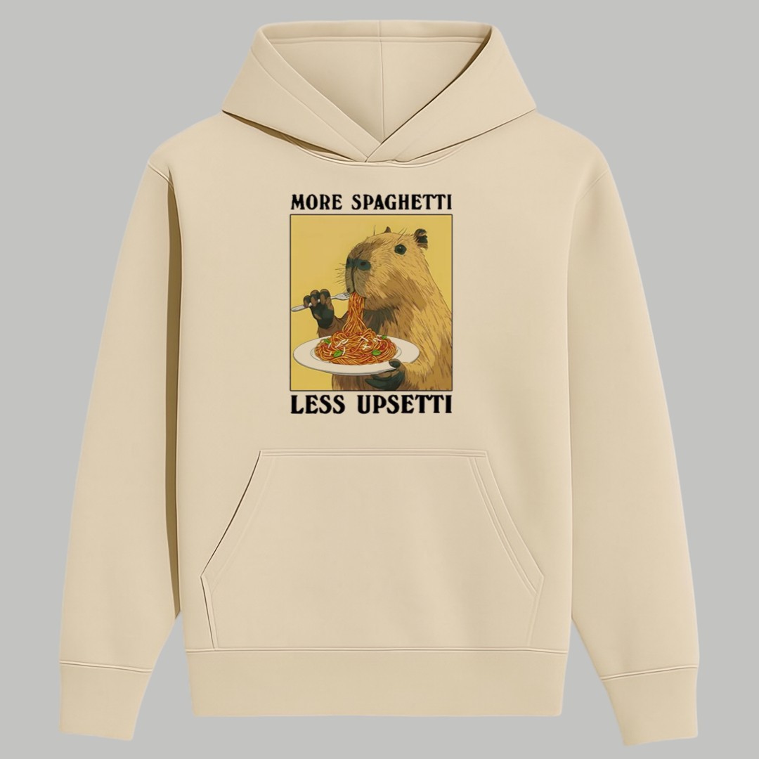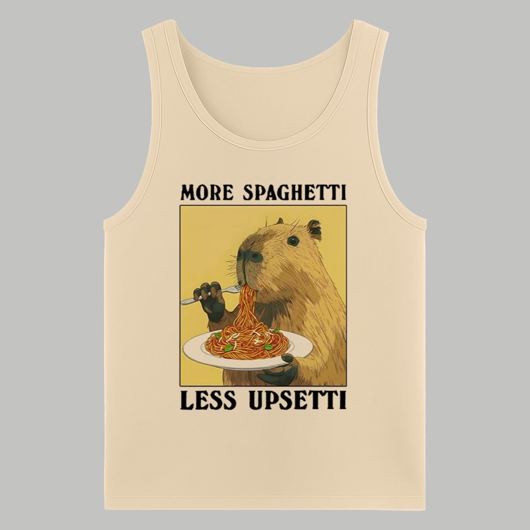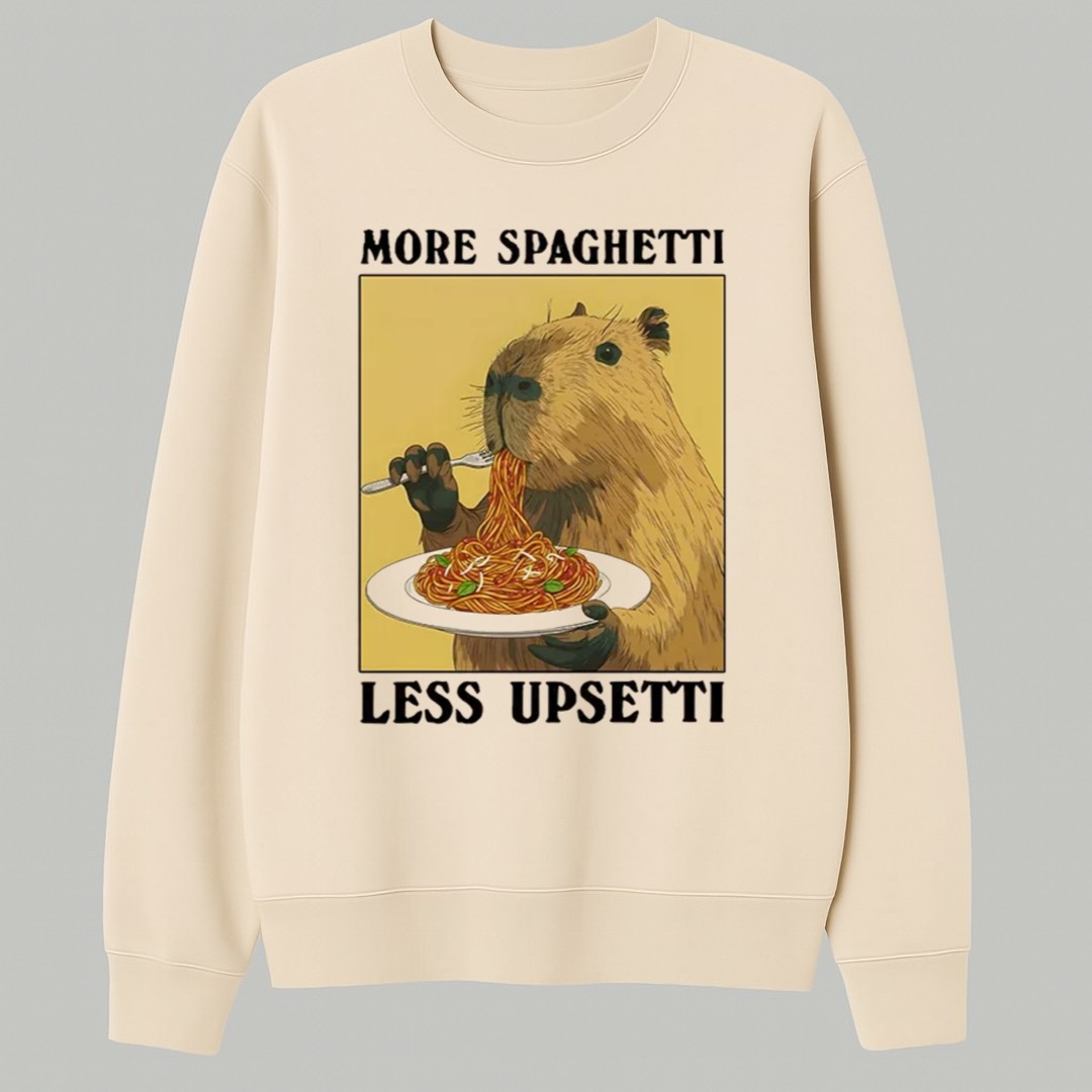 This design captures the “no worries” philosophy that capybaras are famous for. By featuring this peaceful creature enjoying a plate of noodles, the shirt serves as a gentle reminder to slow down and find joy in the simple things. The phrase “More Spaghetti, Less Upsetti” isn’t just a catchy rhyme; it’s a lifestyle choice that encourages a positive mindset and a stress-free attitude toward life’s daily challenges.