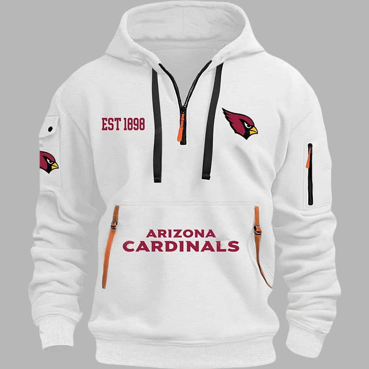 This sleek white hoodie features a modern, quarter-zip design with a unique twist. The front pocket has a large “ARIZONA CARDINALS” logo in a vibrant red font. The right sleeve has a small zip pocket, perfect for storing essentials, and a classic Cardinals logo patch. On the left side, the words “EST 1989” are printed in a clean, red font, a nod to the team’s founding year. The chest has a quarter-zip closure with a long, contrasting black cord. The hood has a cozy fleece lining, and the hoodie is made from a soft, quality fabric that’s perfect for a chilly day.