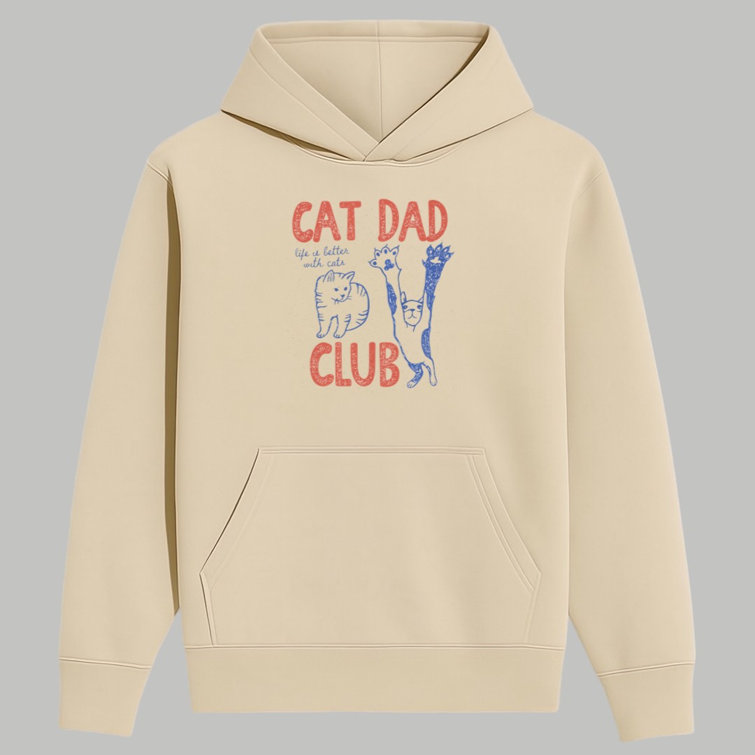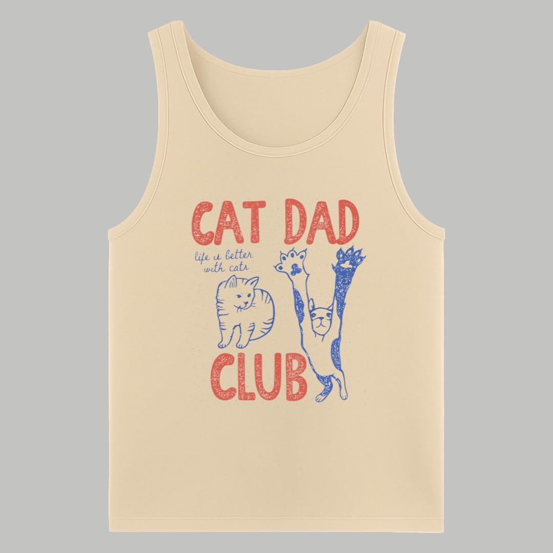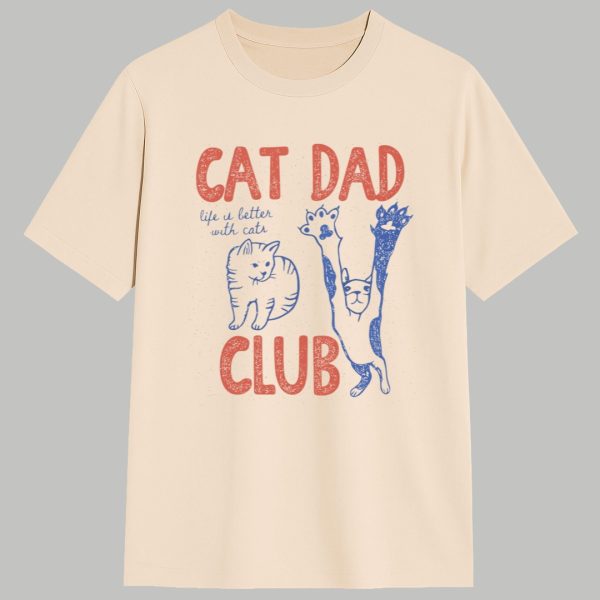 This soft, beige-colored shirt features a charming, vintage-inspired graphic in distressed red and blue. The design prominently features the bold, block text “CAT DAD CLUB,” with the sweet, italicized phrase “life is better with cats” tucked inside. The graphic includes whimsical, sketchy illustrations of two cats: a tiny, grumpy-looking kitten and a larger cat enthusiastically reaching its paws into the air. The overall aesthetic is one of casual comfort and heartfelt, slightly ironic pet devotion. This garment transcends standard graphic tees by recognizing and validating the joy and commitment of male cat owners. It symbolizes the unconditional love, the quiet companionship, and the shared, quirky pride among men who have surrendered their homes and hearts to their feline overlords.