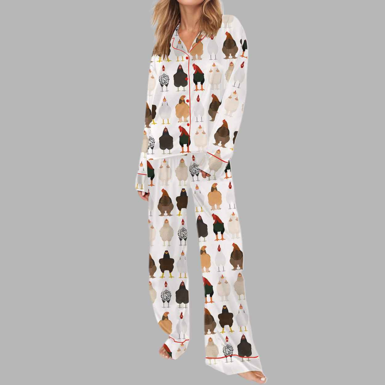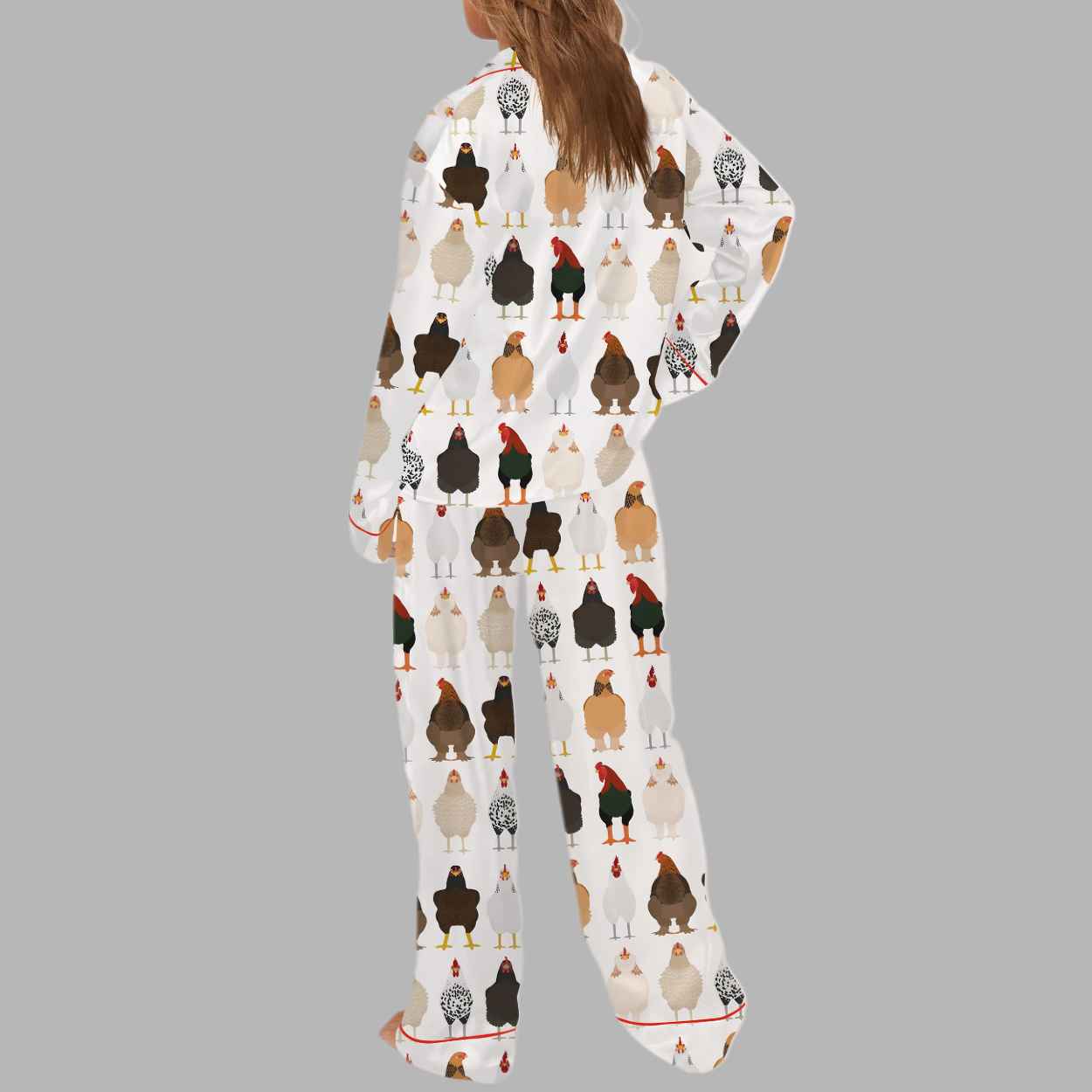The “Chicken Mom Silky Satin Pajama Set” is a sophisticated two-piece sleepwear ensemble that brilliantly marries the smooth, cool touch of satin with the rustic charm of the farmyard. The pristine white fabric is covered in a dense, detailed all-over pattern featuring a delightful variety of chicken breeds—roosters, hens, and bantams, in colors ranging from black and white to speckled and auburn. Each proud bird stands in elegant formation, creating a visually engaging and slightly formal portrait gallery of poultry. This design transforms sleepwear into a unique statement of devotion to one’s flock, symbolizing the deep, often humorous pride of the “Chicken Mom” lifestyle. It speaks to a love for simple living, the joys of the homestead, and the surprising dignity of farm animals. The luxurious sheen of the satin and the long-sleeve, button-down design, neatly framed by contrasting red piping, elevate the traditionally rustic theme into a chic, high-quality garment. This set is more than just comfortable; it’s a visual celebration of the cozy, unique side of pet ownership.