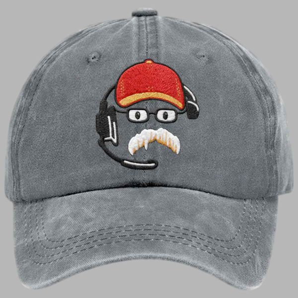 This cap features a relaxed, unstructured design with a washed, charcoal-grey finish, giving it a comfortable, worn-in feel right out of the box. The crown is dominated by an unmistakable, cartoonishly rendered illustration of the team’s celebrated coach. The embroidery captures his most iconic features: the red baseball cap, thick-rimmed glasses, and the recognizable white mustache, complete with a headset and microphone. This simplified, expressive graphic is designed to be instantly recognizable and highly amusing, taking inspiration from the look of a fun sports mascot or print style. This hat is far more than just headwear; it is a piece of wearable comedy and a tribute to the team’s culture. It embodies the tactical genius and beloved personality of the coach, symbolizing the confidence and lightheartedness that permeates the team’s identity. It’s a great way to celebrate the leader of the team and share a laugh about the intense focus of game day.