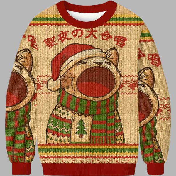 The “Christmas Cantata Ugly Christmas Sweater” is a vibrant, cozy pullover that perfectly merges musical high culture with chaotic animal charm. The sweater features a warm, retro color palette of beige, red, and green, framed by traditional festive bands and stripes, creating a cozy backdrop. The central graphic is a hilarious, repeating image of a cat—dressed in a Santa hat and a chunky plaid scarf—singing with its mouth wide open in a moment of full-throated, dramatic “Christmas Cantata.” Above the central figure, Japanese text, which also refers to a “Christmas Cantata” or “St. Nicholas Night Chorus,” adds an artistic, international flair to the humor. This design is a brilliant piece of visual comedy, transforming the solemnity of a classical chorus into a moment of pure, enthusiastic feline chaos. It transforms the sweater from mere apparel into a statement of joyful, theatrical energy, symbolizing the wearer’s fun-loving spirit and their over-the-top enthusiasm for the holiday season. It’s a warm, comfortable, and immediately eye-catching piece that is perfect for the music lover, the cat enthusiast, or anyone ready to be the life of the party and belt out a questionable carol.