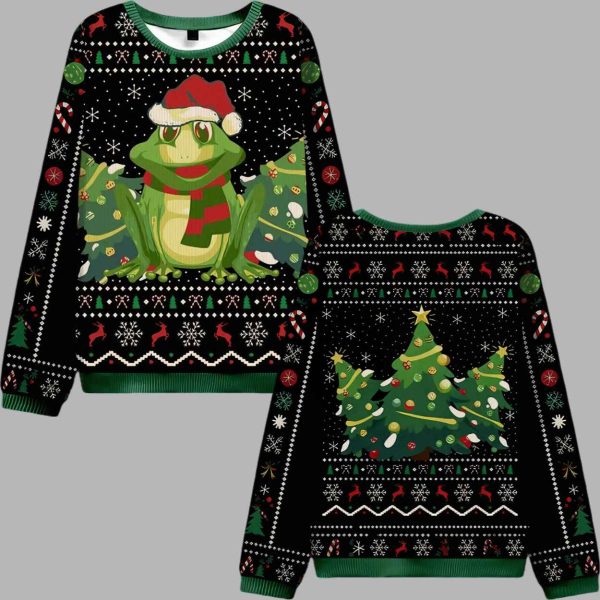 This exceptionally charming and festive sweater is a standout star in the ugly Christmas sweater tradition, designed for those who appreciate adorable animal motifs and classic holiday styling. The captivating center graphic features a large, friendly frog fully dressed for the season, sporting a Santa hat and a cozy red-and-green striped scarf. The frog is nestled amongst brightly decorated Christmas trees, adding to the festive atmosphere. The entire image is set against a dark black background and is framed by traditional fair isle-inspired borders featuring repeating motifs of reindeer, snowflakes, candy canes, and gift bows in classic red, white, and green. This garment is far more than just holiday apparel; it’s a sweet, playful symbol of innocence, unexpected joy, and the universal appeal of holiday whimsy. It’s an ideal way to showcase your love for unique animal graphics and inject some genuinely charming and memorable style into any Christmas gathering, proving that even a swamp creature can be ready for Santa.