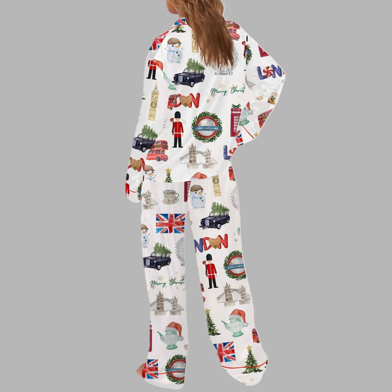 The “Christmas In London Silky Satin Pajama Set” is a stunning two-piece sleepwear ensemble that flawlessly blends the smooth, cool touch of satin with a dense, charming, and highly detailed collage of London’s festive icons. The crisp white fabric is covered in an all-over pattern featuring miniature, stylized illustrations of classic British elements celebrating the holiday season: the iconic red double-decker bus, Big Ben/Elizabeth Tower, the London Eye, Tower Bridge, red telephone booths, and Beefeater guards. These landmarks are cheerfully interspersed with Christmas motifs like snowmen, decorated Christmas trees, wreaths, and Santa hats, with the occasional hidden cup of tea. The central word “LONDON” is featured prominently. This dense, joyful motif transforms sleepwear into a unique, wearable celebration of British holiday magic. It symbolizes the wearer’s love for the history, elegance, and unique festive atmosphere of the city, connecting the comfort of home with the excitement of a London holiday adventure. The luxurious sheen of the satin and the long-sleeve, button-down design, neatly framed by contrasting red piping, elevate this whimsical theme into a chic, high-quality garment. This set is more than just comfortable; it’s a visual tribute to the cozy, sophisticated side of holiday indulgence.