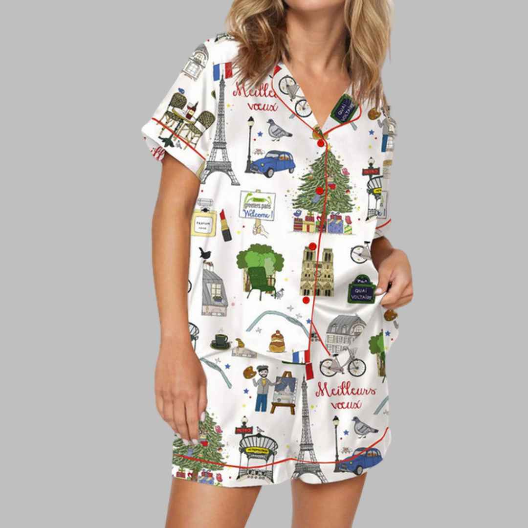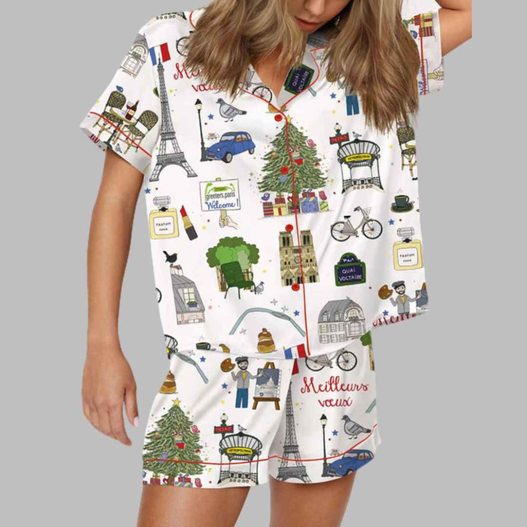 - Parisian Elegance: The Christmas In Paris Satin Pajama Set brings the magic of Paris into your home. The intricate design captures the beauty and romance of the city, making it a unique and stylish choice for anyone who loves Paris or wants to experience its festive charm.