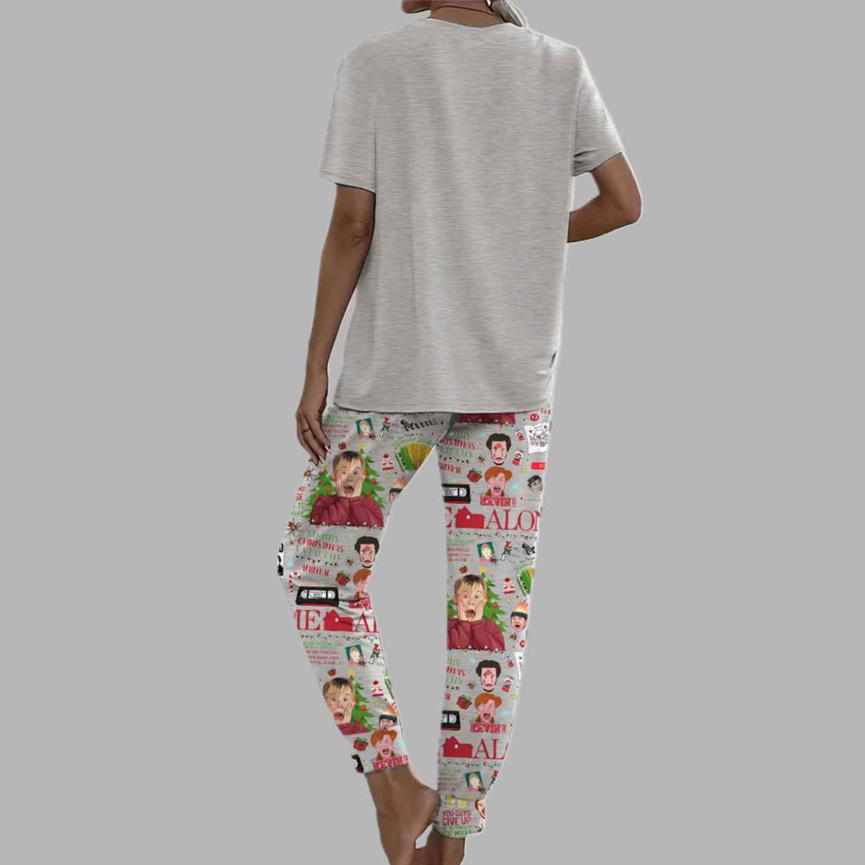 This relaxed, comfortable pajama set consists of a simple, short-sleeved top and matching drawstring trousers, both made from a soft, breathable fabric. The light gray top features a minimalist center column graphic showcasing recognizable elements and characters from the iconic movie, including various expressive faces and key symbols like the battle plan. The trousers, however, are an action-packed collage, covered in a dense, all-over pattern featuring memorable scenes, character portraits (like the famous screaming face and the “Wet Bandits”), VHS tape graphics, and unforgettable quotes such as “MERRY CHRISTMAS, YA FILTHY ANIMAL” and “HOME ALONE.” This pajama set’s meaning is a heartfelt celebration of holiday nostalgia, shared cinematic tradition, and the enduring fun of childhood mischief. It signifies a deep connection to a film that is essential viewing every December, turning beloved quotes and chaotic scenes into a cozy, wearable narrative. Wearing this set means you’re ready for ultimate comfort while broadcasting your love for one of the greatest Christmas stories ever told—a tale of courage, booby traps, and the importance of family.