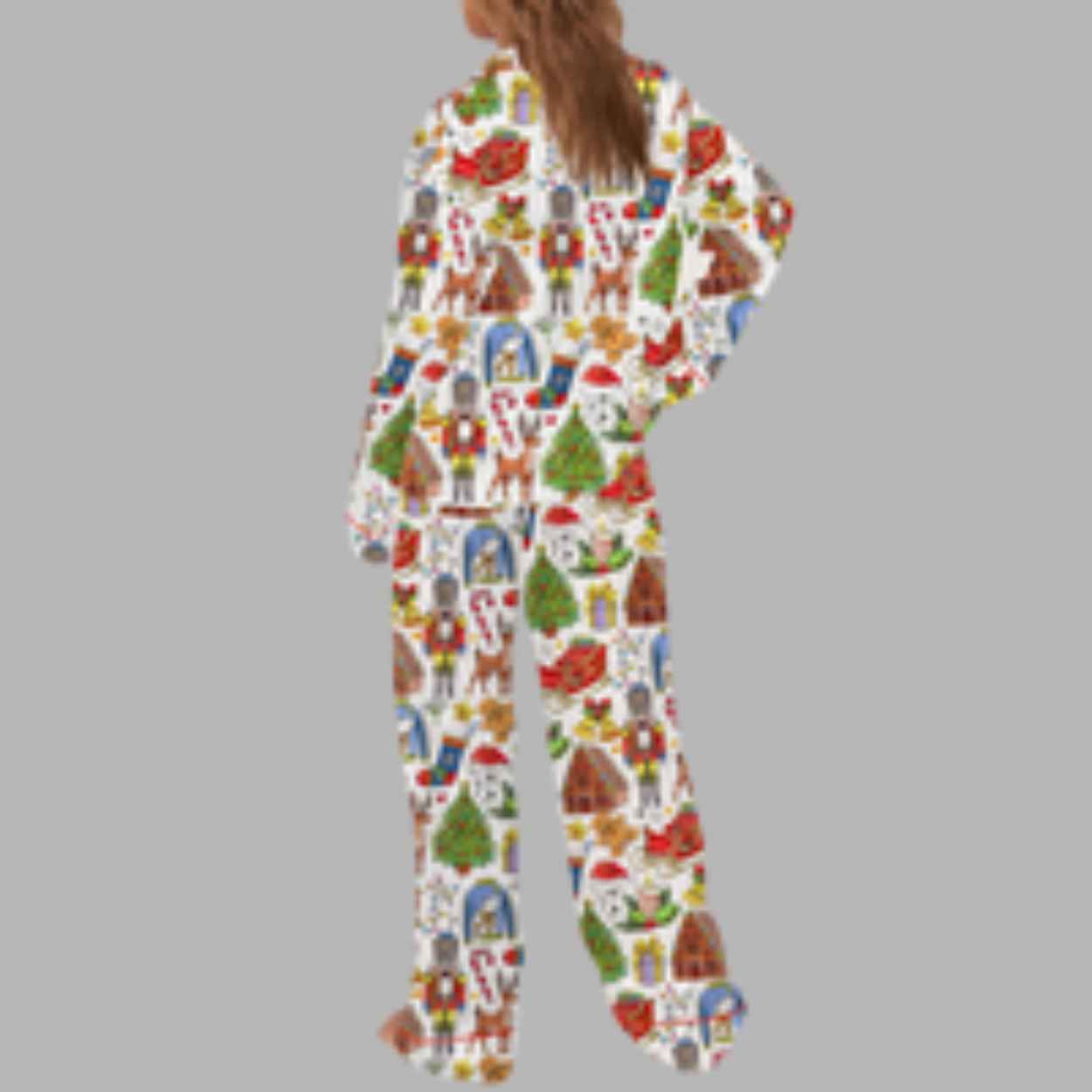 The print is a detailed tapestry of holiday favorites, including: Gingerbread men and houses, reindeer, fully decorated Christmas trees, Nutcrackers, Santa hats, sleds and sleighs, candy canes, Christmas stockings, bells, and wrapped gifts. The top is a classic button-down shirt with a notched collar and long sleeves. The matching pants feature an elastic waist for a comfortable, relaxed fit. The fabric is a smooth, quality satin, cool-to-the-touch feel and a beautiful sheen, making it feel elegant yet fun. This set is designed to be machine washable and easy to care for, ensuring your festive pajamas stay bright and beautiful throughout the holiday season.