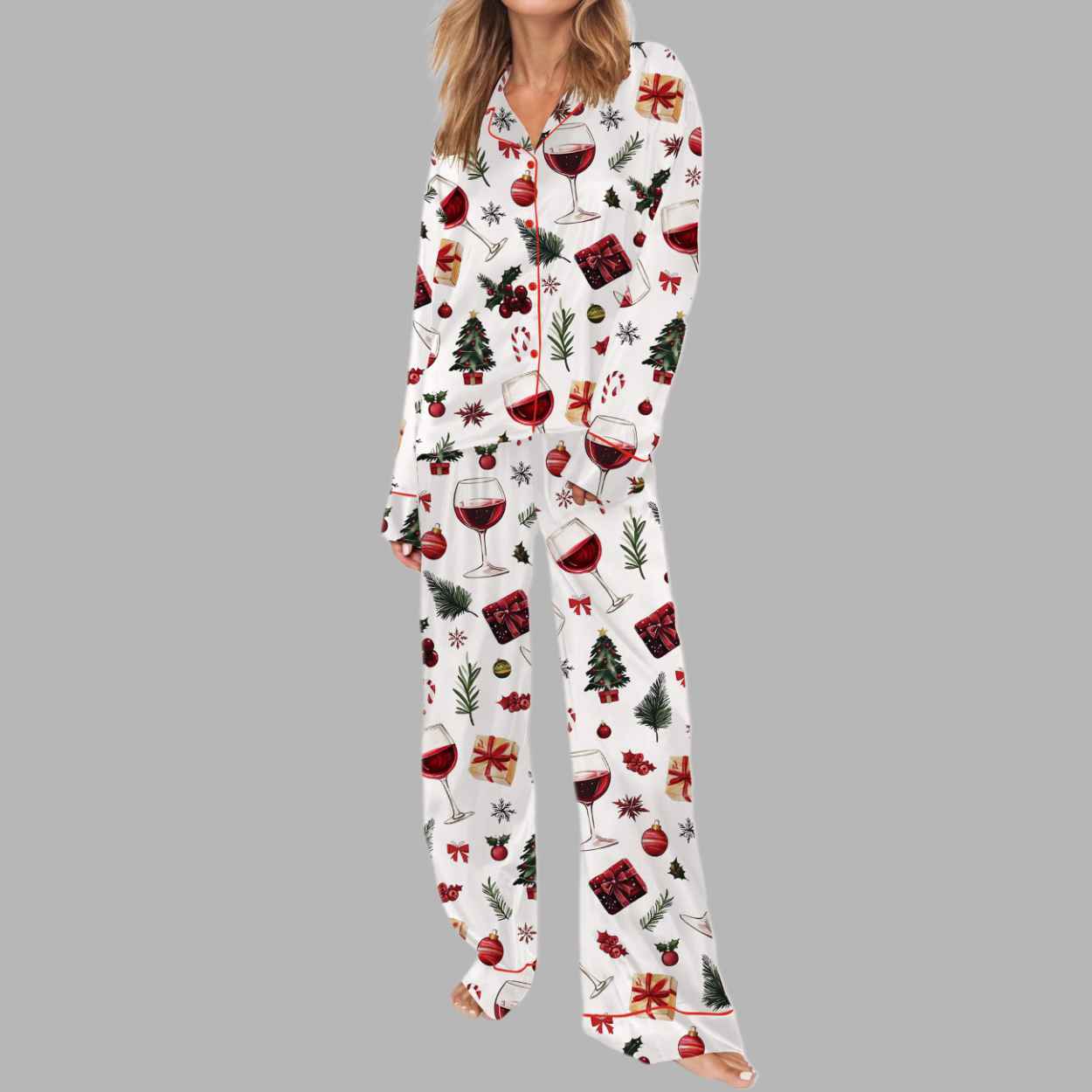 The “Christmas Wine Silky Satin Pajama Set” is a stunning two-piece sleepwear ensemble that brilliantly marries the smooth, cool touch of satin with a chic holiday theme. The crisp white fabric is covered in a lush, detailed all-over pattern featuring classic elements like miniature decorated Christmas trees, holly, snowflakes, and festive red and gold ornaments. Crucially, these icons are interspersed with elegant stemmed wine glasses filled with deep red liquid and wrapped gift boxes, creating a sophisticated and spirited motif. This design transforms sleepwear into a refined statement of holiday indulgence, symbolizing the cozy comfort and grown-up pleasures of the festive season. It speaks to the joy of relaxing by the fire, savoring a glass, and enjoying the elegance of a peaceful evening. The luxurious sheen of the satin and the long-sleeve, button-down design, neatly framed by contrasting red piping, elevate the garment into a piece of quality, memorable sleepwear. This set is more than just comfortable; it’s a visual celebration of the cozy, chic side of holiday indulgence.