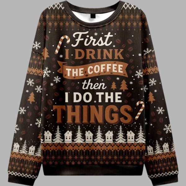 This cozy sweater features a rich, dark brown knit, reminiscent of deep, dark-roast coffee, combined with warm cream and light brown accents. The design cleverly blends traditional fair isle elements—like snowflakes, pine trees, and charming winter village scenes—with clear coffee motifs, including scattering coffee beans. The center of the sweater is adorned with the bold, white, and widely relatable quote: “FIRST I DRINK THE COFFEE then I DO THE THINGS.” Candy canes accent the text, blending the message seamlessly with the holiday theme. This sweater’s meaning is a witty celebration of daily ritual, modern necessity, and humorous self-awareness. It acknowledges the foundational role caffeine plays in powering the busy, and sometimes chaotic, holiday season. Wearing this piece signals a fun, honest, and high-energy (post-caffeine, of course) personality, instantly connecting you with fellow morning-strugglers and coffee lovers. It’s the perfect way to make a universally understood, cozy statement about the engine that drives your festive cheer.