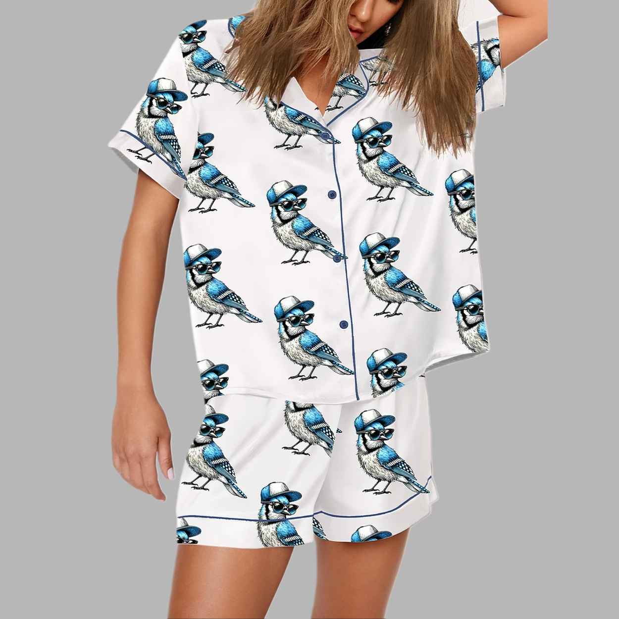 The “Cool Blue Jays Bird Pajama Set” is a comfortable, two-piece sleepwear ensemble that features a uniquely stylish all-over pattern. Against a clean, white background, the design is filled with a repeating image of the majestic blue jay, not in a traditional mascot uniform, but rocking a backwards baseball cap and a pair of cool sunglasses. This creative, tongue-in-cheek take on the team’s symbolic bird transforms the pajamas into a statement of casual confidence and a laid-back, modern fandom. It perfectly captures the “off-duty” style of a true fan—relaxed, unbothered, and always representing. The image of the blue jay, typically a symbol of aggressive team spirit, is softened here into a quirky, fashionable icon, symbolizing the fun, cool side of being a dedicated supporter. The short-sleeve button-down top and matching shorts are neatly trimmed with contrasting blue piping, offering a cool, light, and comfortable fit that makes this set ideal for lounging on a sunny afternoon or chilling while watching the game.