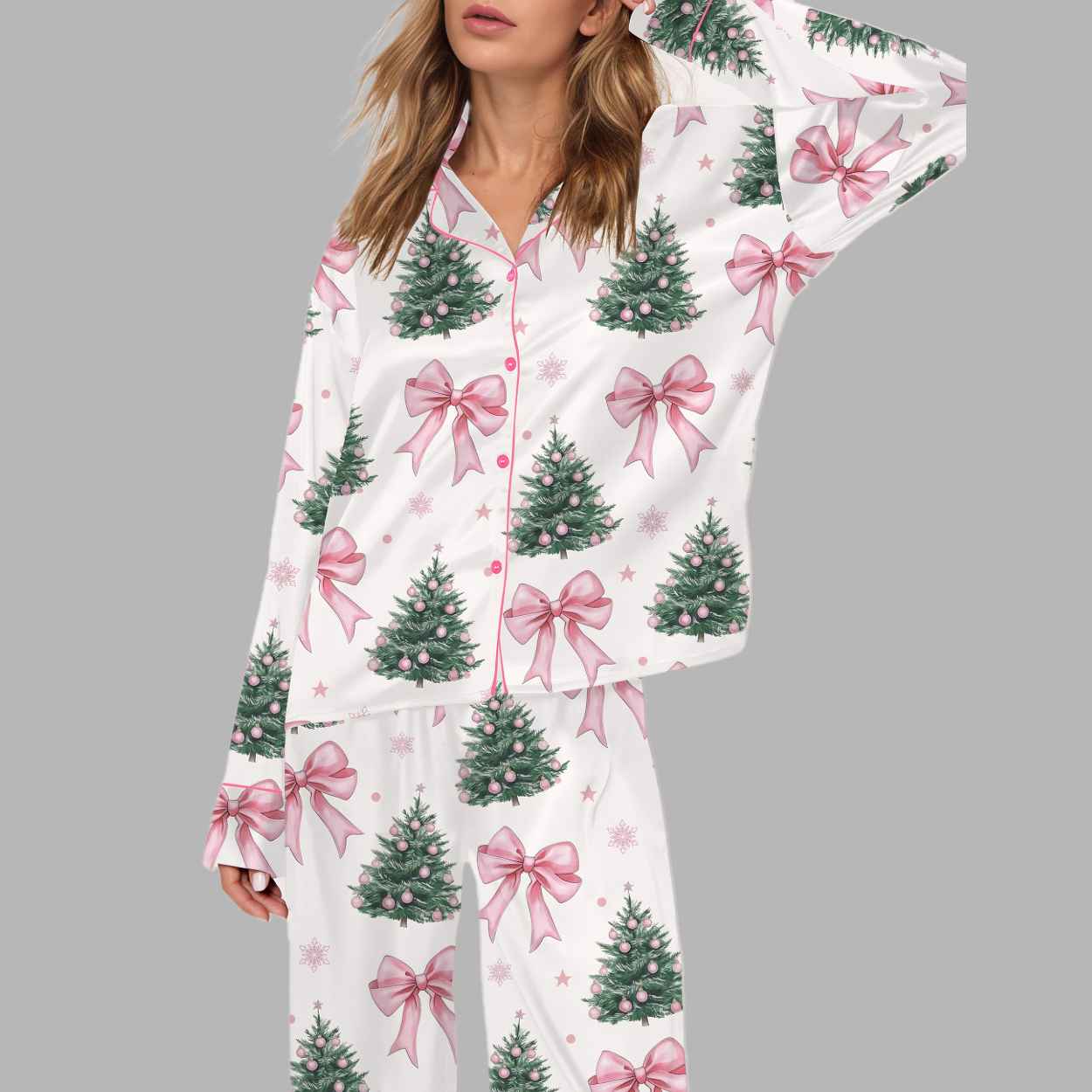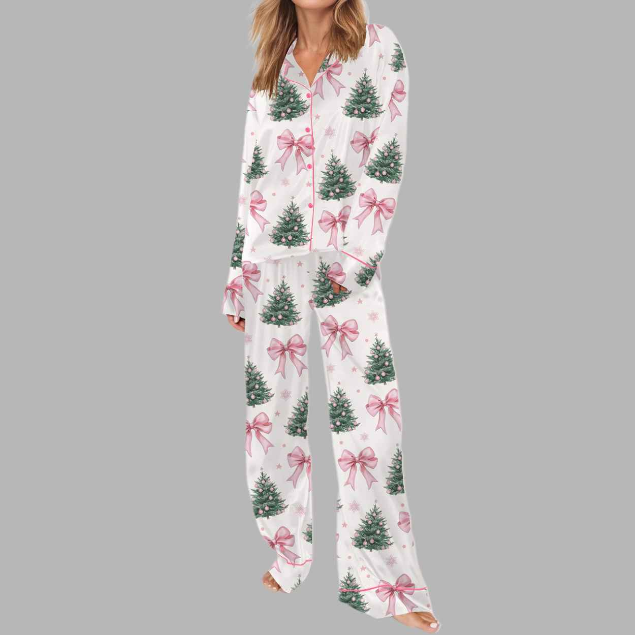 Ready to elevate your holiday lounging with a touch of playful, ultra-feminine charm? Indulge in luxurious comfort and delicate festive style with the stunning “Coquette Christmas Tree Silky Satin Pajama Set.”