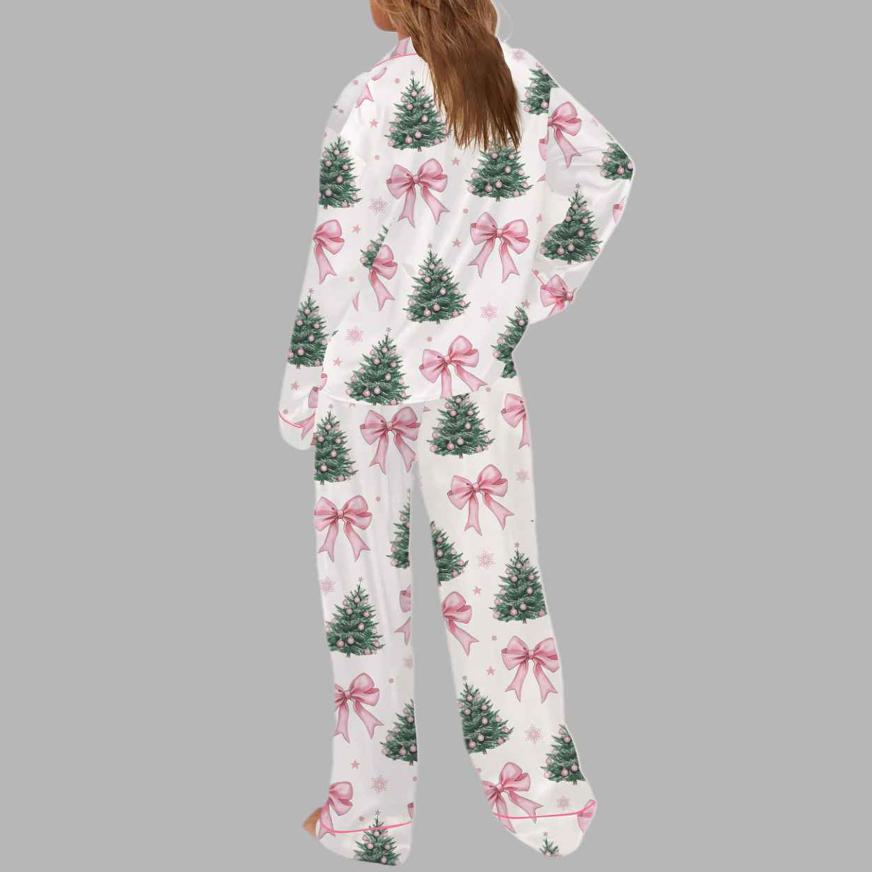 Feminine Festive Charm: The Elegant “Coquette Christmas Tree Silky Satin Pajama Set”