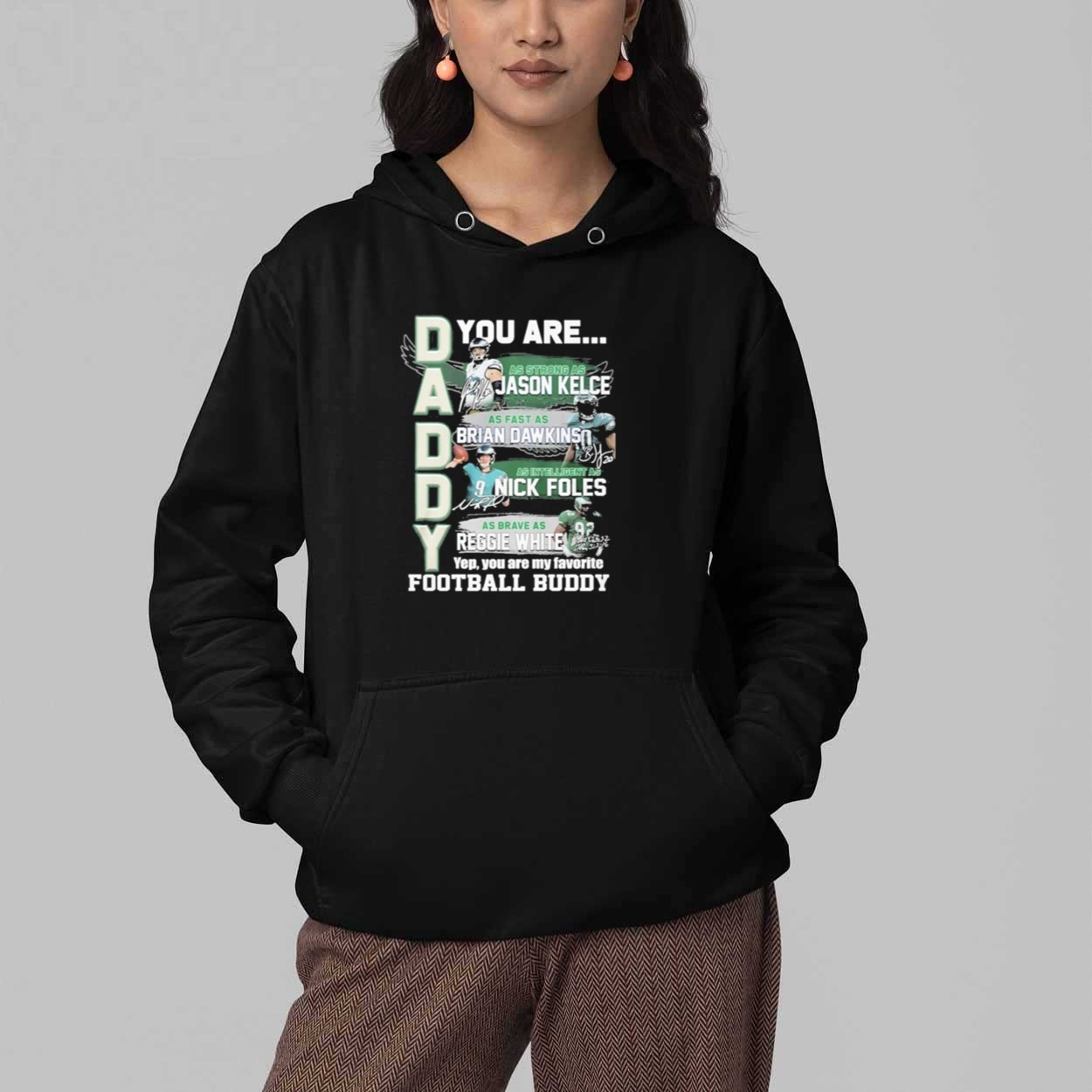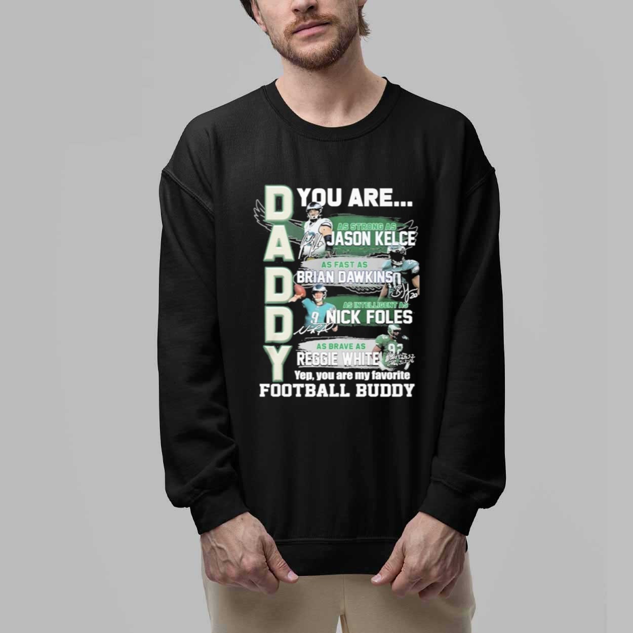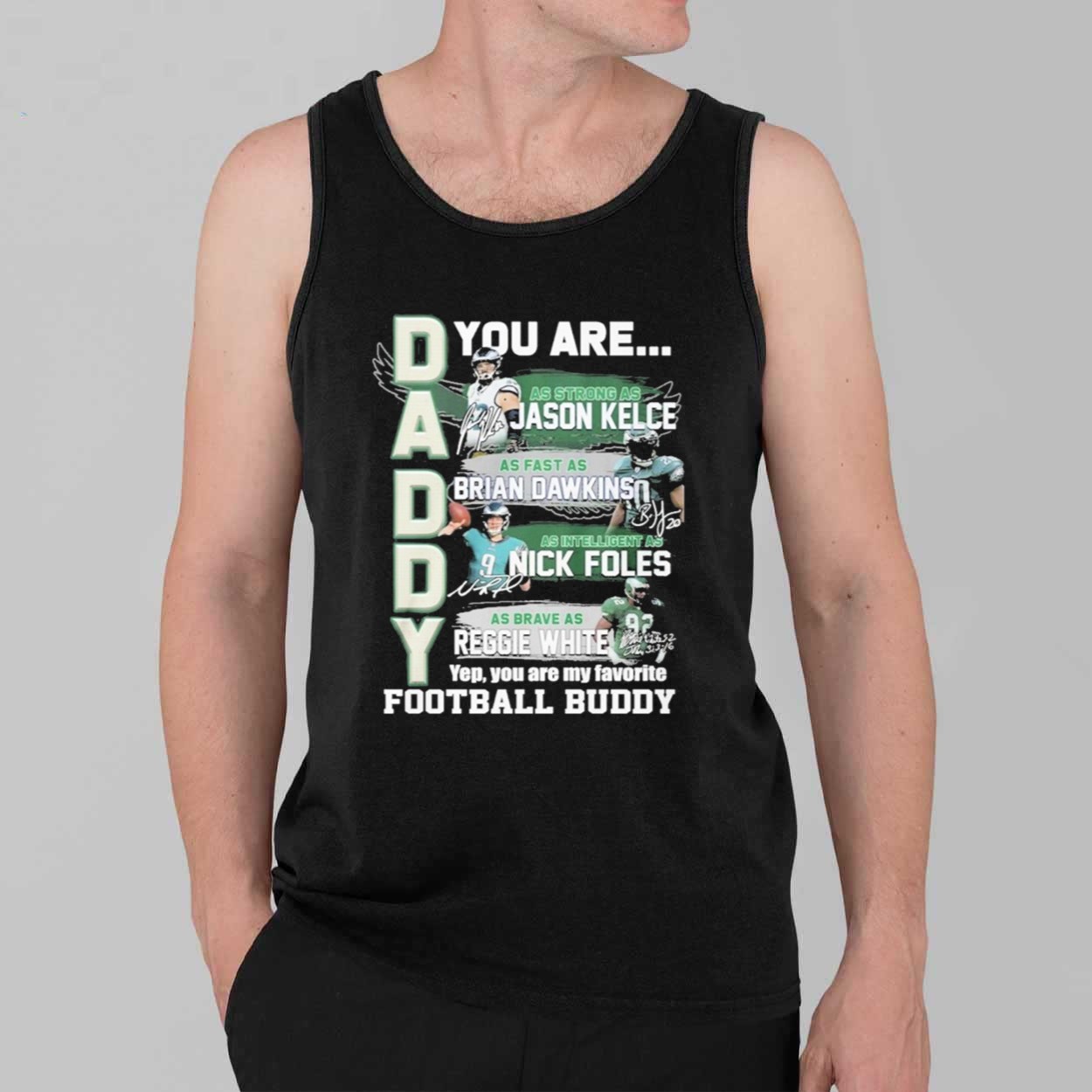 This sleek black t-shirt features a bold and dynamic graphic. The left side of the shirt has the word “DADDY” in large, block letters. The right side features a series of images of four Eagles legends: Jason Kelce, Brian Dawkins, Nick Foles, and Reggie White. Each image is paired with a quality that defines them: “AS STRONG AS JASON KELCE,” “AS FAST AS BRIAN DAWKINS,” “AS INTELLIGENT AS NICK FOLES,” and “AS BRAVE AS REGGIE WHITE.” The bottom of the shirt reads, “Yep, you are my favorite FOOTBALL BUDDY,” making it a personal and heartfelt message.