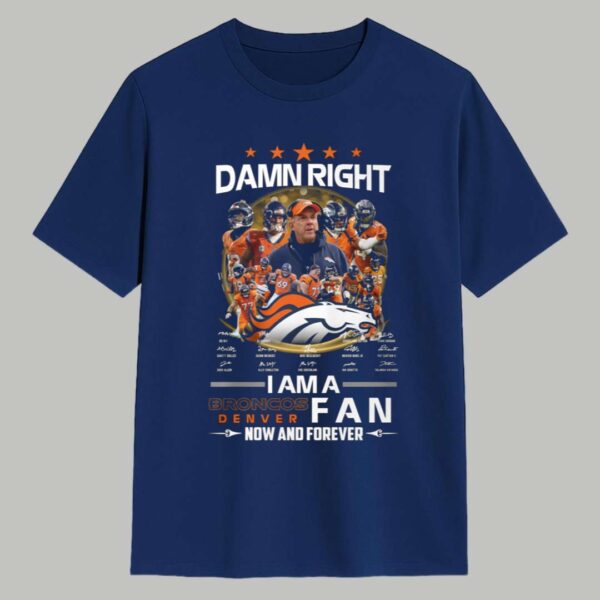 The Damn Right I Am A Broncos Fan Shirt features a powerful collage that brings the spirit of the team to life, showcasing the coach and key players in a dynamic, action-oriented layout. This design is highlighted by the iconic horse head logo and printed signatures of the roster, symbolizing the deep connection between the team and its community. It isn’t just a garment; it is a visual history of grit and determination, designed for those who have stood by their team through every victory and challenge.