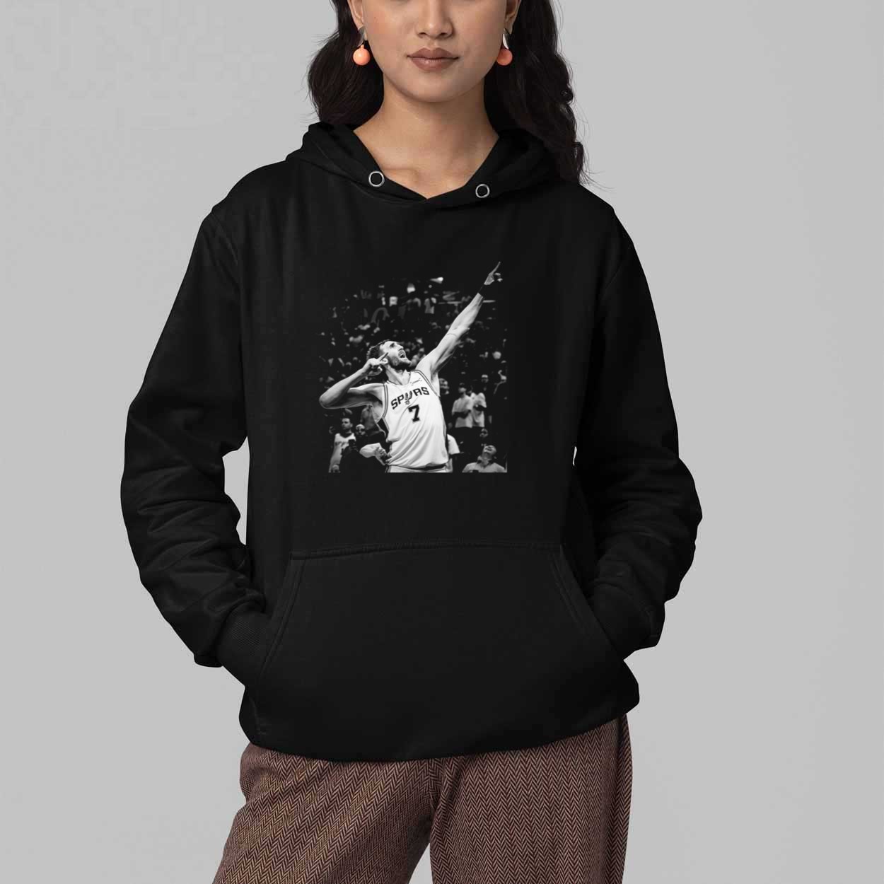 This bold black T-shirt features a powerful black-and-white photograph capturing a specific, exciting moment on the court—a player pointing triumphantly towards the sky, celebrating a key play in front of an energized crowd. This apparel is a tribute to the intensity, dedication, and iconic personalities that define the game. By showcasing an athlete in a moment of pure victory and emotion, the shirt allows the wearer to feel connected to the excitement and drama of the sport. It’s a statement piece that celebrates outstanding athletic performance and the indelible memories created by these stars.