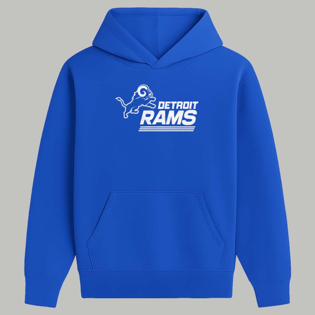 This royal blue t-shirt features a clever and meaningful design that blends the identities of two iconic football cultures. The front displays a sleek, white silhouette of a leaping lion combined with the classic “G” and “LA” horn elements, anchored by bold “DETROIT RAMS” typography. Beyond its sharp aesthetic, this garment represents a unique moment in sports history, honoring the shared players and mutual respect that have linked these two cities together. It is a creative masterpiece designed for those who value deep-rooted sports narratives and want to wear a piece of apparel that tells a story of brotherhood, resilience, and cross-country loyalty.
