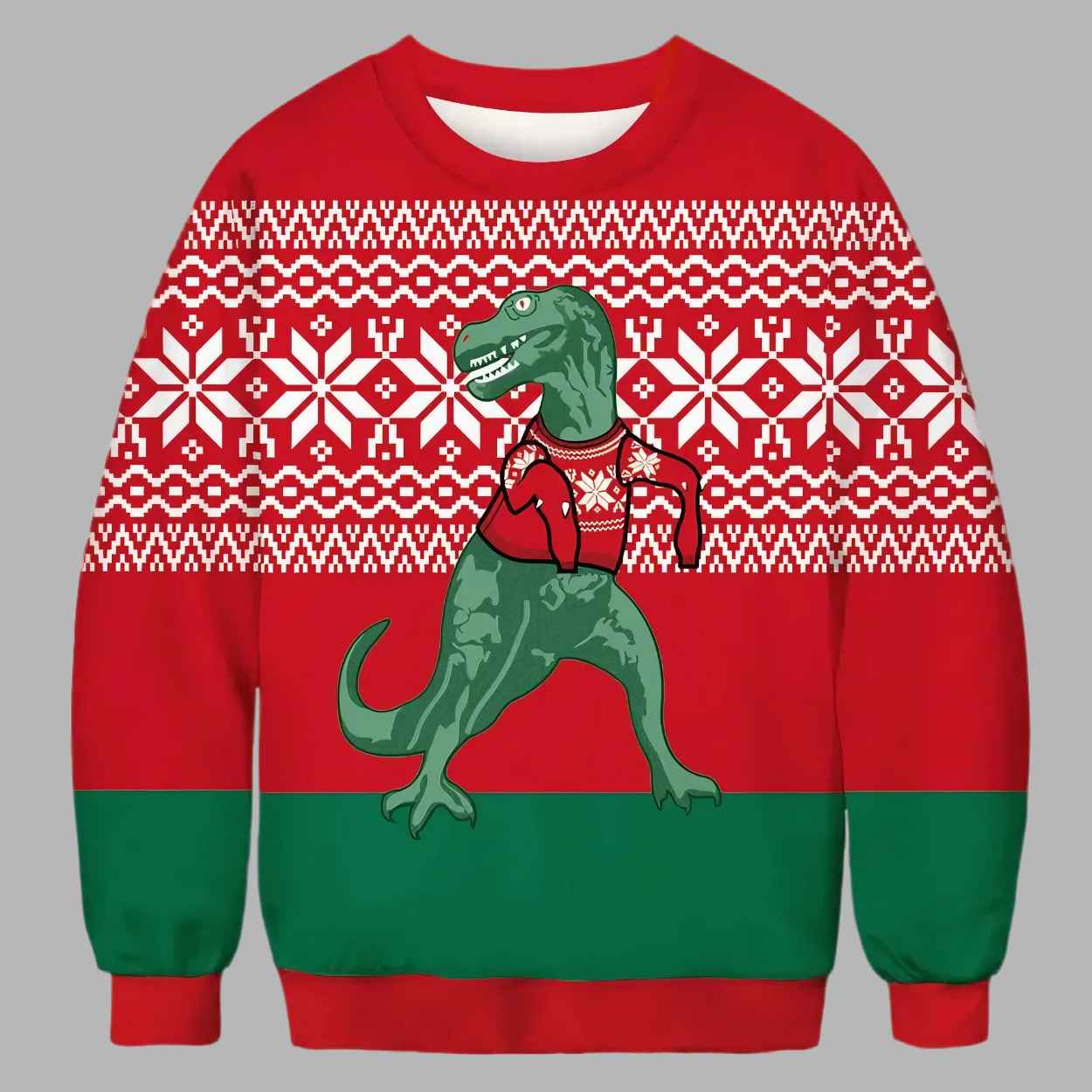 You need this sweater because the hilarious T-Rex-wearing-a-sweater graphic is an instant smile-inducer and conversation starter; the classic red and green color blocking ensures you look festive despite the unconventional mascot; it elevates the ugly sweater tradition with a truly original, prehistoric, and whimsical design; it serves as a perfect, unique gift for dinosaur lovers, science enthusiasts, or anyone who appreciates quirky humor; and its comfortable, cozy aesthetic ensures you stay warm while having a rawr-some time all season long.