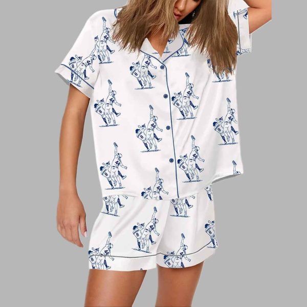 The “Dodgers 2025 World Series Catch Kiss-Cut Pajama Set” is a comfortable, stylish two-piece sleepwear ensemble that transforms into a visual highlight reel of spectacular defensive teamwork. The crisp white fabric is covered in a clean, repeating pattern featuring stylized line-art illustrations of players mid-air, making a breathtaking outfield catch. The dynamic pose—two figures leaping and reaching with outstretched gloves, with visible jersey numbers (like 44 and 8)—is instantly recognizable to fans, symbolizing the high-energy teamwork and game-saving brilliance required for elite defense. This action-centric pattern is a sophisticated, fan-focused nod to the thrilling potential of the team’s defensive core and their aspirations for the 2025 World Series. It elevates casual sleepwear into a statement of intimate fandom, allowing the wearer to feel personally connected to the emotional high of a game-saving moment. The short-sleeve button-down top and matching shorts are neatly trimmed with contrasting blue piping, offering a cool, light, and comfortable fit that makes this set the ideal gear for both restful sleep and excited, game-day lounging.