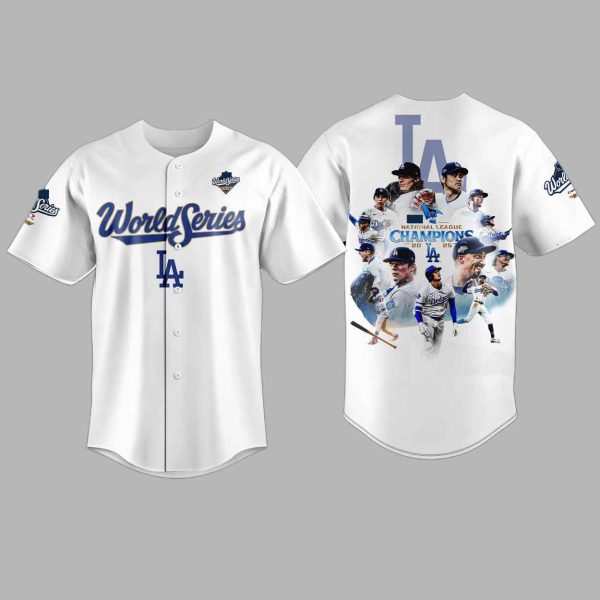 This stunning, commemorative jersey is a direct and powerful tribute to the team’s triumph in the 2025 World Series. The front of the jersey features the bold, elegant script text “World Series” arching above the iconic LA logo in team blue, clearly signifying the peak achievement. The back of the jersey is a powerful, high-resolution montage, showcasing a dynamic collage of key players in action and celebration, overlaid with the powerful title “NATIONAL LEAGUE CHAMPIONS” and the 2025 designation. The entire design, set against the crisp white base, is a wearable monument to the team’s excellence, dedication, and the collective realization of a monumental athletic dream. It’s an ideal way to celebrate the thrilling victories, the dedication of the players, and the electric energy of the sport, perfect for game days, celebrations, or displaying as a piece of cherished memorabilia.