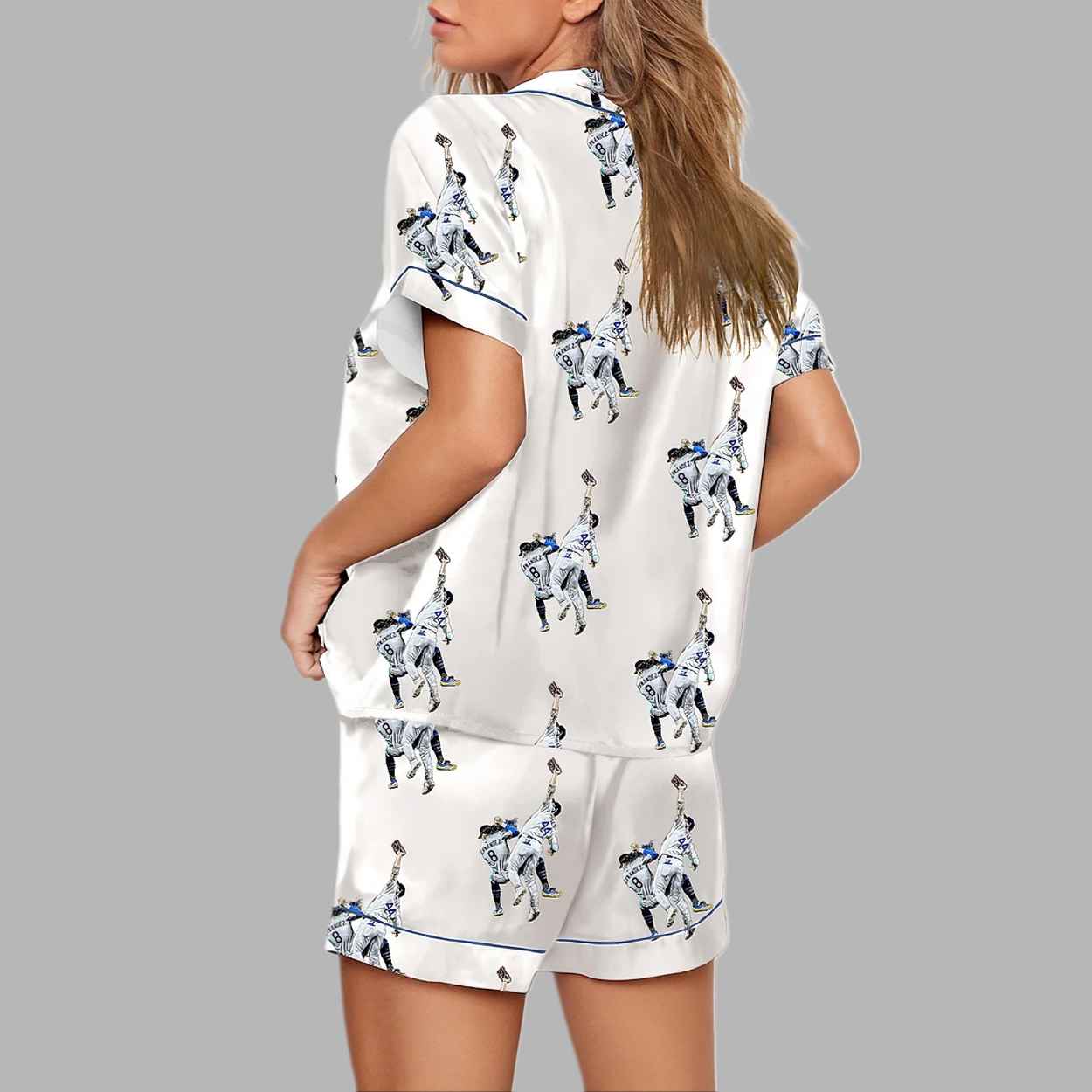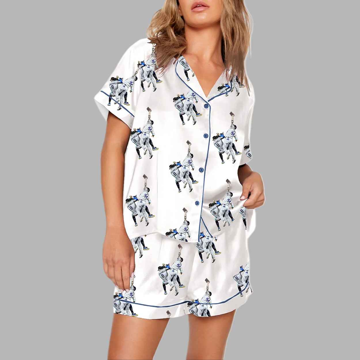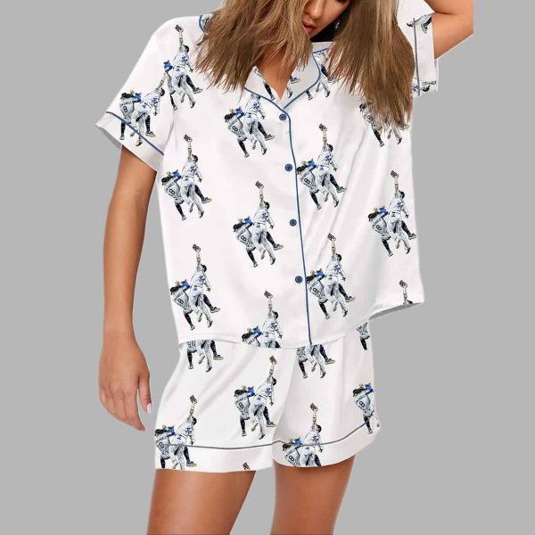 The “Dodgers Andy Pages Kike Hernandez Outfield Catch Baseball Pajama Set” is a comfortable, stylish two-piece sleepwear ensemble that transforms into a visual highlight reel of one of baseball’s most exciting plays. The crisp white fabric is covered in a clean, repeating pattern featuring stylized illustrations of two key players in their uniforms, captured mid-air during a breathtaking, back-to-back outfield catch. The dynamic pose—leaping, reaching, and colliding—is instantly recognizable to fans, symbolizing the high-energy teamwork and spectacular athleticism required for elite defense. This detailed, action-centric pattern is a sophisticated, fan-focused nod to the thrilling potential of the team’s defensive core. It elevates casual sleepwear into a statement of intimate fandom, allowing the wearer to feel personally connected to the emotional high of a game-saving moment. It embodies the hope and high expectations of the fan base, wrapping the wearer in the spirited energy of a championship-caliber team. The short-sleeve button-down top and matching shorts are neatly trimmed with contrasting blue piping, offering a cool, light, and comfortable fit that makes this set the ideal gear for both restful sleep and excited, game-day lounging.