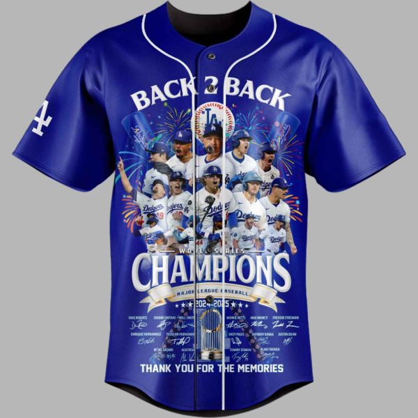 The “Dodgers Back 2 Back World Series 2025 Jersey” is a vibrant, custom royal blue baseball jersey that stands as the pinnacle of fan ambition and celebratory design. The entire front panel is a stunning, high-energy composite graphic centered around the massive declaration: “BACK 2 BACK.” Below this, the dominant text “WORLD SERIES CHAMPIONS” anchors the design, framed by the aspirational dates “2024 • 2025.” The image features a dynamic, triumphant collage of players celebrating a victory, set against a backdrop of stadium fireworks and confetti, symbolizing the electric joy of a title win. Along the bottom, a commemorative banner lists the names and stylized signatures of the expected key contributors of the team, recognizing the collective talent required for consecutive wins. Finally, the ribbon along the hem carries the heartfelt message, “THANK YOU FOR THE MEMORIES,” acknowledging the history while looking forward. This jersey transcends mere fan apparel; it is a powerful, visual prophecy—a wearable monument to a potential era of dominance. It embodies the unwavering belief, the excitement, and the pride of a fan base that demands the highest level of achievement. It’s a comfortable, breathable, and visually spectacular piece perfect for game days, celebrations, or simply showing absolute confidence in the team’s destiny.