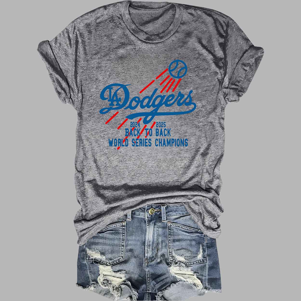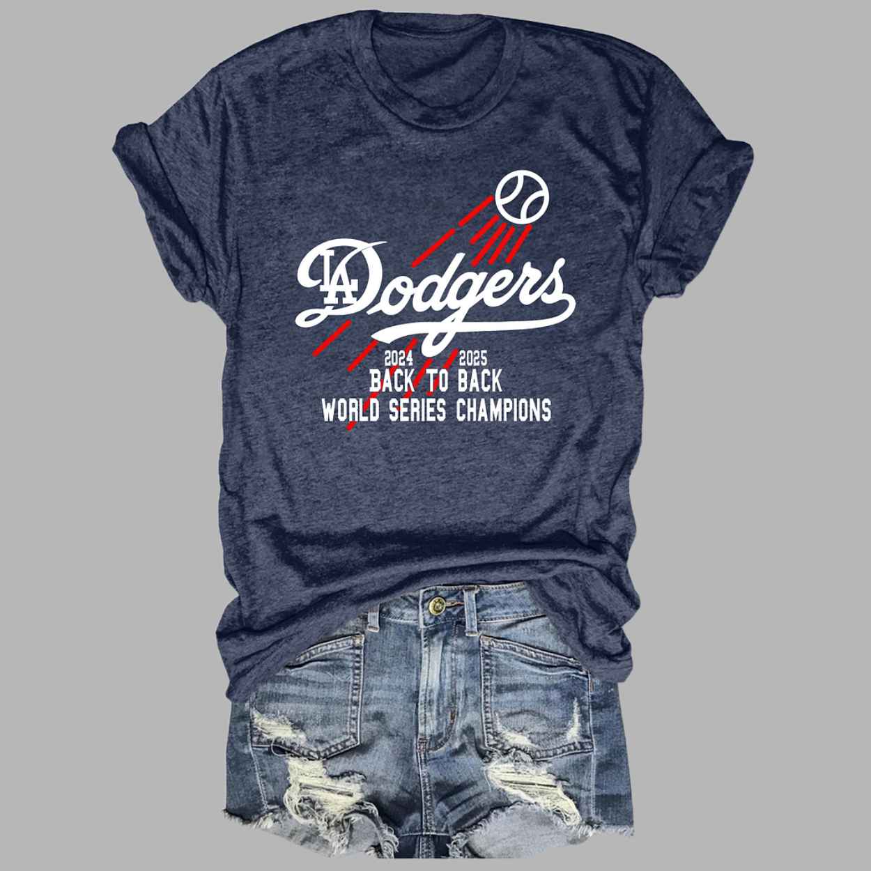 The “Dodgers Back To Back World Series Tee” is a comfortable, stylish t-shirt set on a soft, heathered royal blue, embodying the team’s signature color. The front features a bold, clean graphic that serves as a direct, powerful statement of fan prophecy. The classic “Dodgers” script logo is prominently displayed, with a graphic baseball soaring overhead, leaving dynamic red trails that signify speed and power. Below the script, the aspirational message is clearly stated: “2024 2025 BACK TO BACK WORLD SERIES CHAMPIONS.” This design is more than comfortable casual wear; it is a visual prophecy—a wearable testament to the fan base’s collective confidence and the expectation that the team will dominate the League and secure consecutive championships. It transforms the shirt into a statement of unwavering belief, symbolizing the thrilling potential of a sustained era of greatness. The shirt’s soft, classic fit ensures it is a versatile, year-round wardrobe staple for cheering from the couch, the stadium, or simply showing absolute confidence in the team’s future.