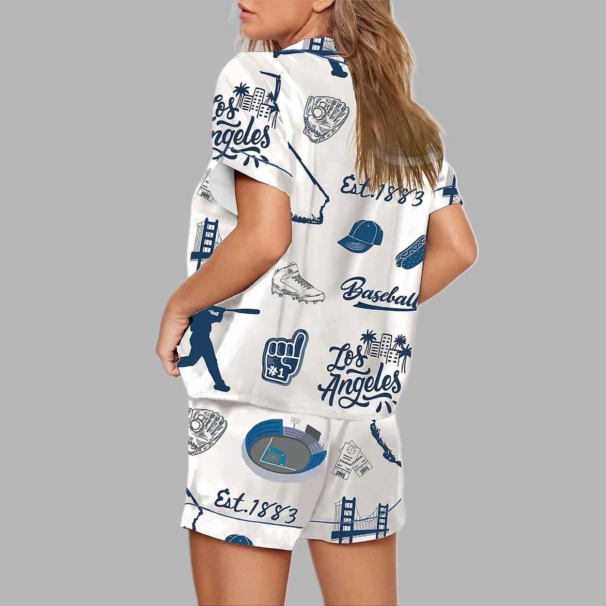 The “Dodgers Baseball World Series Champions Pajama Set” is a comfortable, stylish two-piece sleepwear ensemble featuring a captivating, hand-drawn style pattern on a crisp white background. The design is a dynamic collage of elements that celebrate both the team and its iconic city. It includes clear graphics of a batter in mid-swing, baseball cleats, stadium snacks like hot dogs, foam fingers, tickets, and abstract symbols of Los Angeles, such as the skyline, palm trees, and even a large suspension bridge motif. Phrases like “Los Angeles” and “Baseball Est. 1883” add a vintage, heritage feel, nodding to the team’s long history. The implied “World Series Champions” title within the overall theme is a powerful expression of fan pride and high expectations. This pattern transforms casual sleepwear into a wearable mosaic of baseball culture and L.A. identity, symbolizing the inseparable bond between the team, the city, and the dreams of victory. The short-sleeve button-down top and matching shorts are neatly trimmed with contrasting blue piping, offering a cool, light, and comfortable fit that makes this set the ideal uniform for ultimate relaxation.