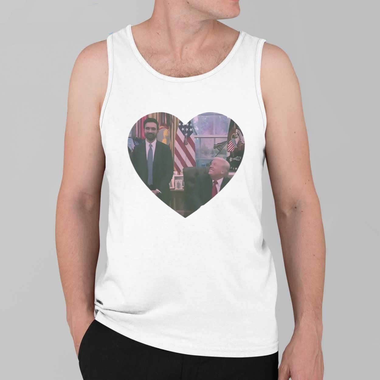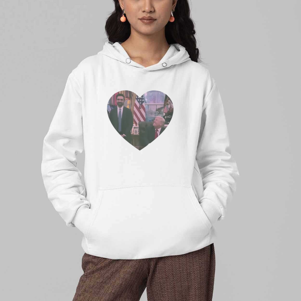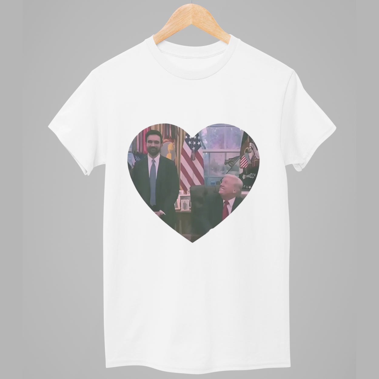 This classic, clean white shirt provides a simple canvas for its powerful, satirical graphic. The image features a photograph of Donald Trump and Zohran Mamdani framed within a prominent, large black heart shape. The picture itself shows the two figures in what appears to be a formal setting, possibly the Oval Office, with the American flag visible in the background. The juxtaposition of the heart motif—a symbol of affection—with two prominent political figures who represent vastly different ideological spectrums is the core of the shirt’s humor. This shirt’s meaning is a brilliant piece of political satire, irony, and commentary on the strangeness of contemporary discourse. It forces viewers to reconcile two seemingly opposite political figures being linked by a symbol of affection, highlighting the humor in unexpected alliances or dramatic contrasts. Wearing this piece signals a sharp, witty, and politically engaged personality, someone who is willing to find the comedy in complex political situations and challenge assumptions through visual humor. It’s the perfect, casual way to make a bold, unforgettable statement that encourages thought and laughter.