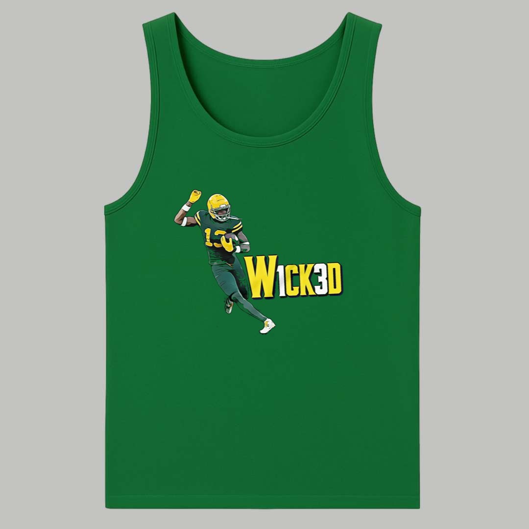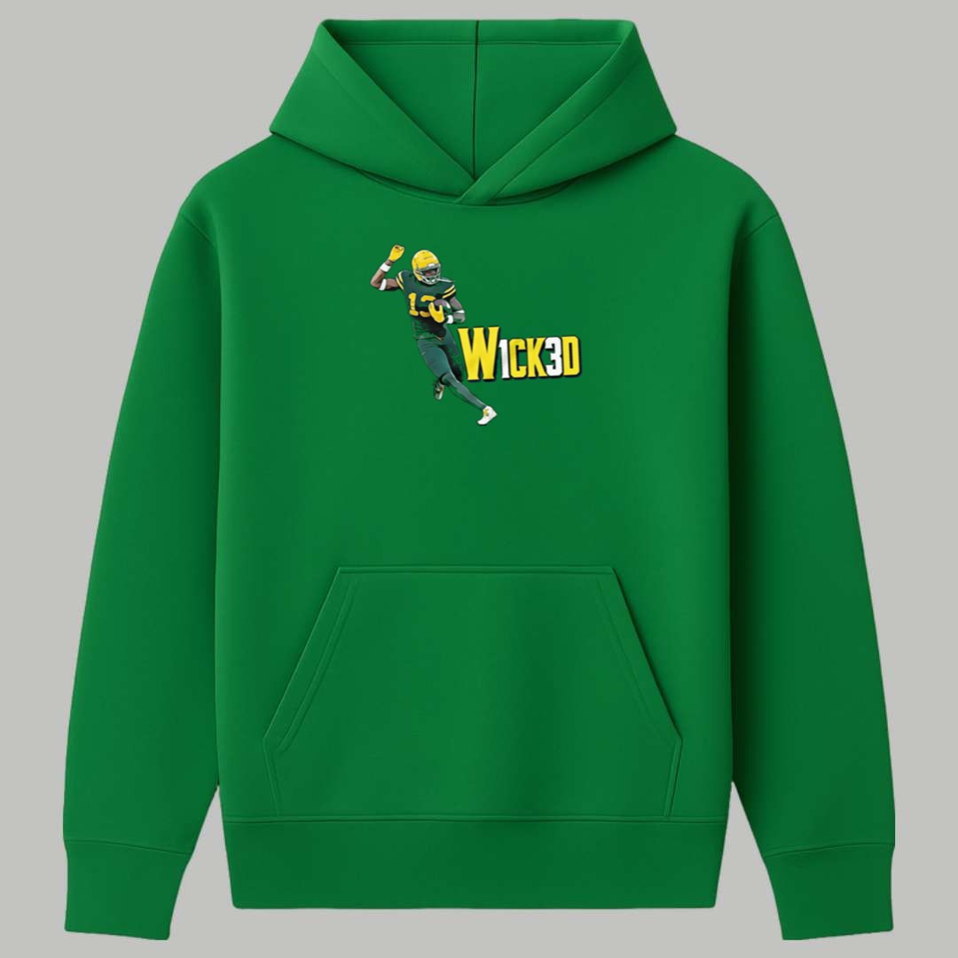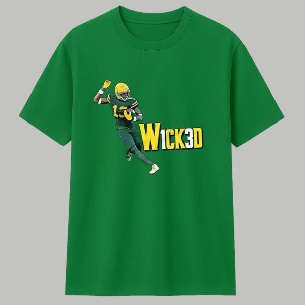 This vibrant green shirt features a dynamic graphic centered on the receiver Dontayvion Wicks, captured in an action pose while running down the field. The player is shown wearing his team uniform, and the bold, stylized text “W1CK3D” is prominently displayed next to him in bright yellow lettering, utilizing the popular phonetic spelling that serves as his signature motto or nickname. The overall design captures the high energy and excitement associated with a player who consistently makes big plays. This garment transcends standard fan wear by transforming a simple piece of clothing into a celebration of individual talent, athletic excellence, and the unforgettable moments a star brings to the field. It symbolizes the fierce pride and electric anticipation shared by the fanbase for their electrifying receiver.