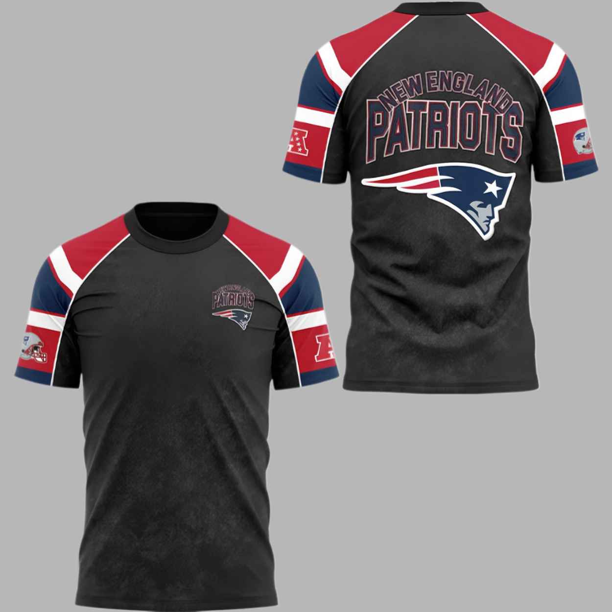 This shirt features a dynamic black design with striking red, white, and blue accents on the shoulders and sleeves, reminiscent of classic athletic apparel. The back prominently features the team’s name, “NEW ENGLAND PATRIOTS,” surrounding the iconic logo, while the sleeves also display team colors and logos. The overall aesthetic is one of powerful athleticism and vintage-inspired design, perfectly suited for the dedication of a new, highly anticipated player like Drake Maye. This garment transcends standard fan wear by symbolizing the anticipation and hope that come with a major team addition. It embodies a blend of honoring the club’s history while eagerly looking forward to the next competitive phase, making it a proud, wearable statement of enduring fan commitment and excitement for future success.