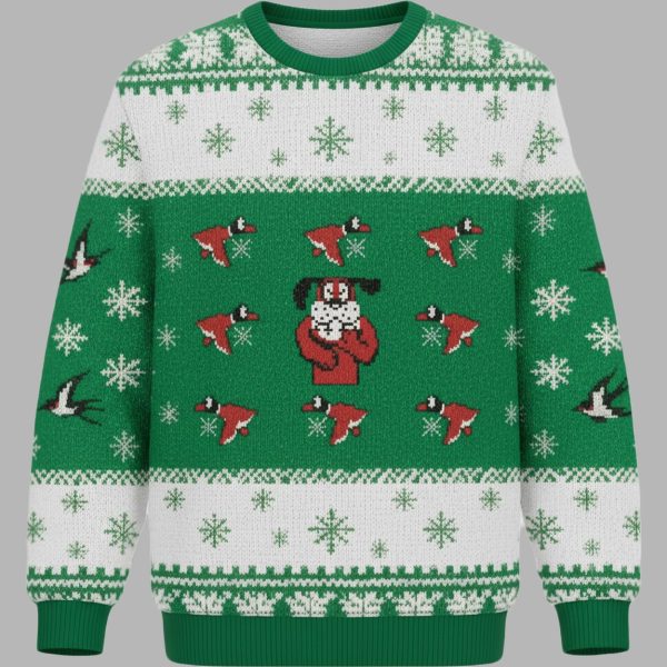 This spectacular sweater features a classic, cozy color palette of crisp white and vibrant Christmas green, immediately setting a festive scene. The centerpiece graphic is a brilliant, instantly recognizable nod to the famous 8-bit hunting game: the iconic pixelated dog is shown laughing maniacally (or celebrating), surrounded by defeated ducks flying away. This image perfectly captures the frustration, humor, and ultimate triumph associated with the classic retro game. The entire design cleverly blends this niche, gaming-related humor with traditional “ugly Christmas sweater” motifs. The sweater is framed by intricate borders of large snowflakes and rows of tiny Christmas trees, all rendered in white and green. Repeating patterns of flying ducks and small stars are scattered throughout the background, enhancing the playful, pixelated aesthetic. This sweater is far more than a simple novelty item; it’s a brilliant piece of visual comedy that celebrates shared cultural history and the joy of finding humor in childhood memories. It transforms the act of hunting virtual ducks into a funny, festive theme, suggesting that the best way to enjoy the holidays is by embracing nostalgia and a good-natured laugh. It appeals to the wearer who possesses a sharp, self-aware sense of humor and uses irony to navigate the season, making it a comfortable, witty, and immediate symbol of retro fun.