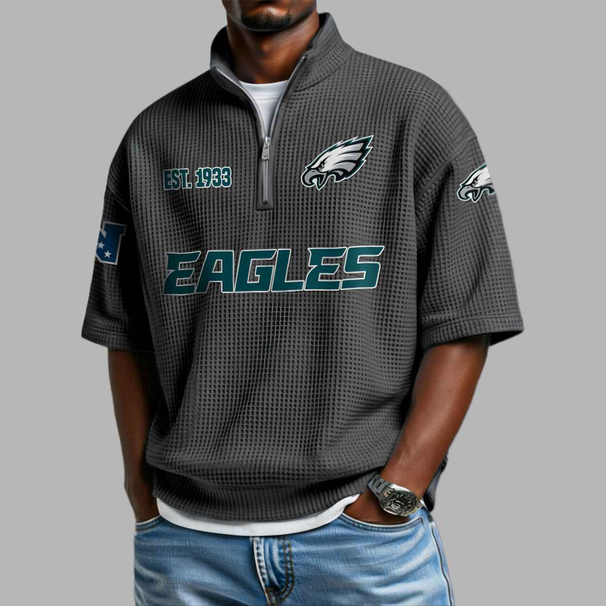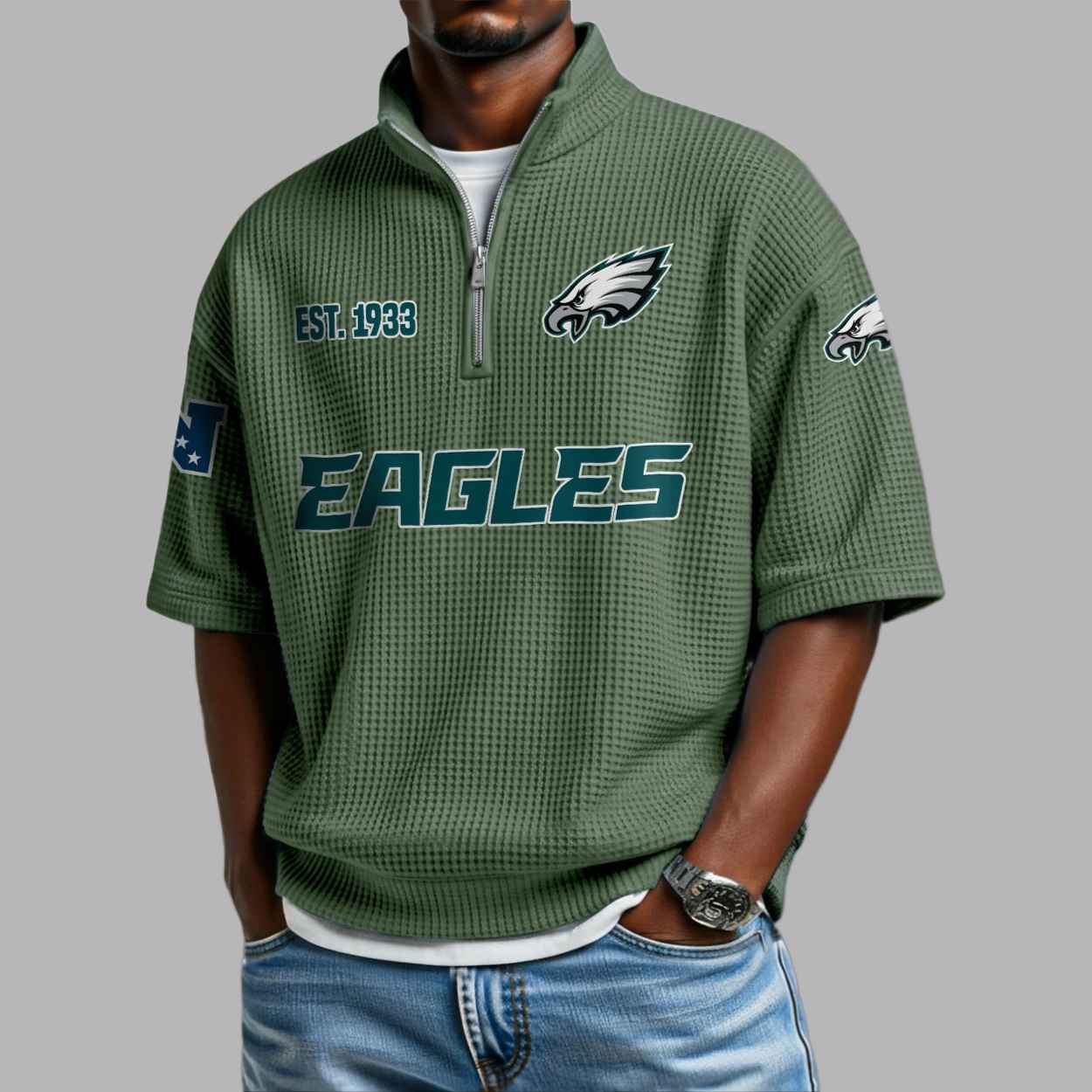 This textured olive green quarter-zip shirt features a modern waffle-knit aesthetic that perfectly highlights the team’s iconic midnight green and white accents. The chest proudly displays a sharp eagle head logo alongside the historic “EST 1933” founding date, while bold “EAGLES” typography anchors the central design. This apparel is more than just a stylish top; it is a visual tribute to the resilience and deep-rooted traditions of the Philadelphia community. Every detail, from the additional eagle emblems on the sleeves to the clean zip-up neckline, represents a connection to over nine decades of soaring spirit and sporting heritage. It is a refined way to wear your loyalty while honoring a legacy that has unified dedicated supporters for generations.