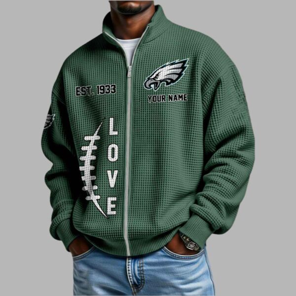 Embrace nearly a century of gridiron tradition and showcase your enduring team loyalty with the premium Eagles EST 1933 Waffle Half Zip Sweatshirt.