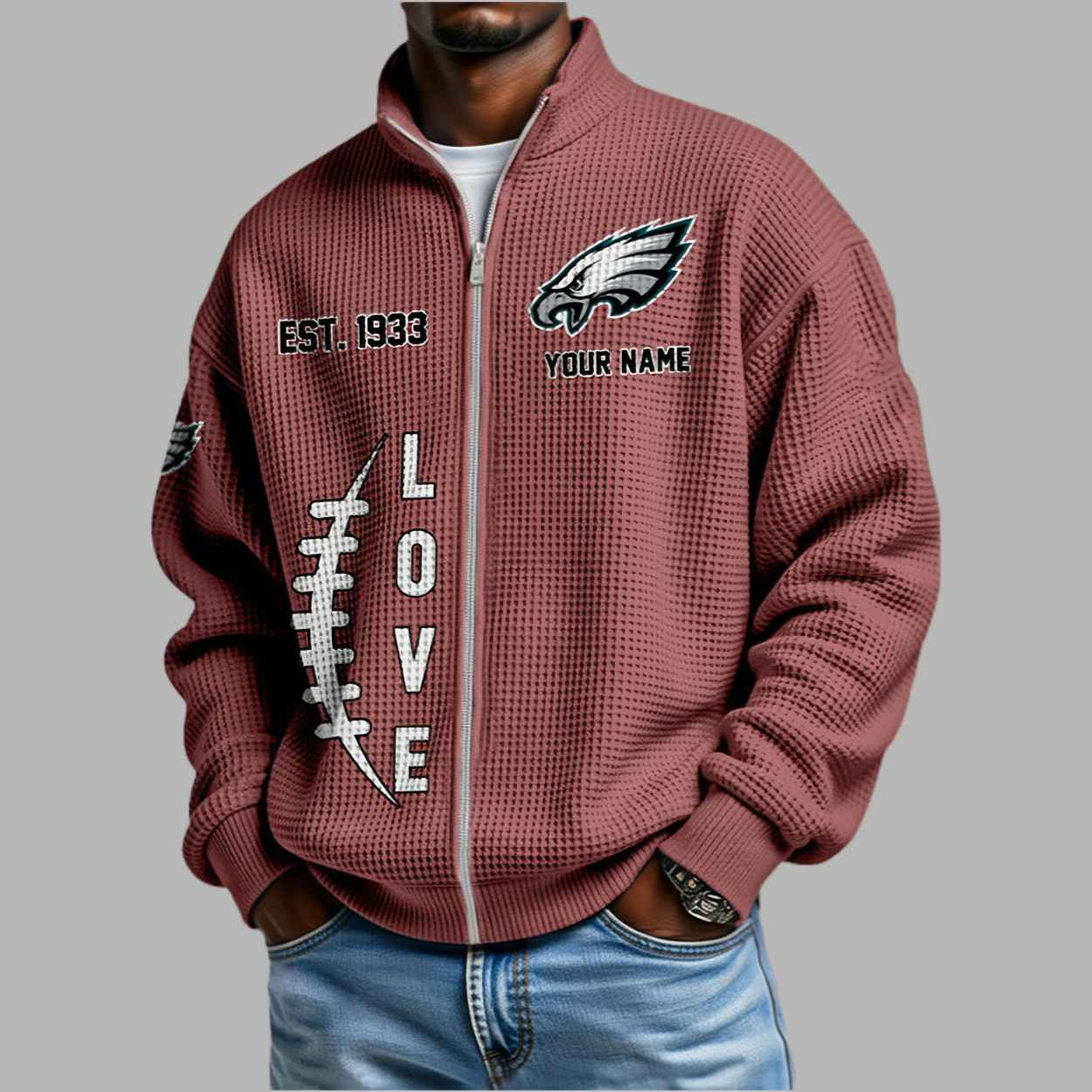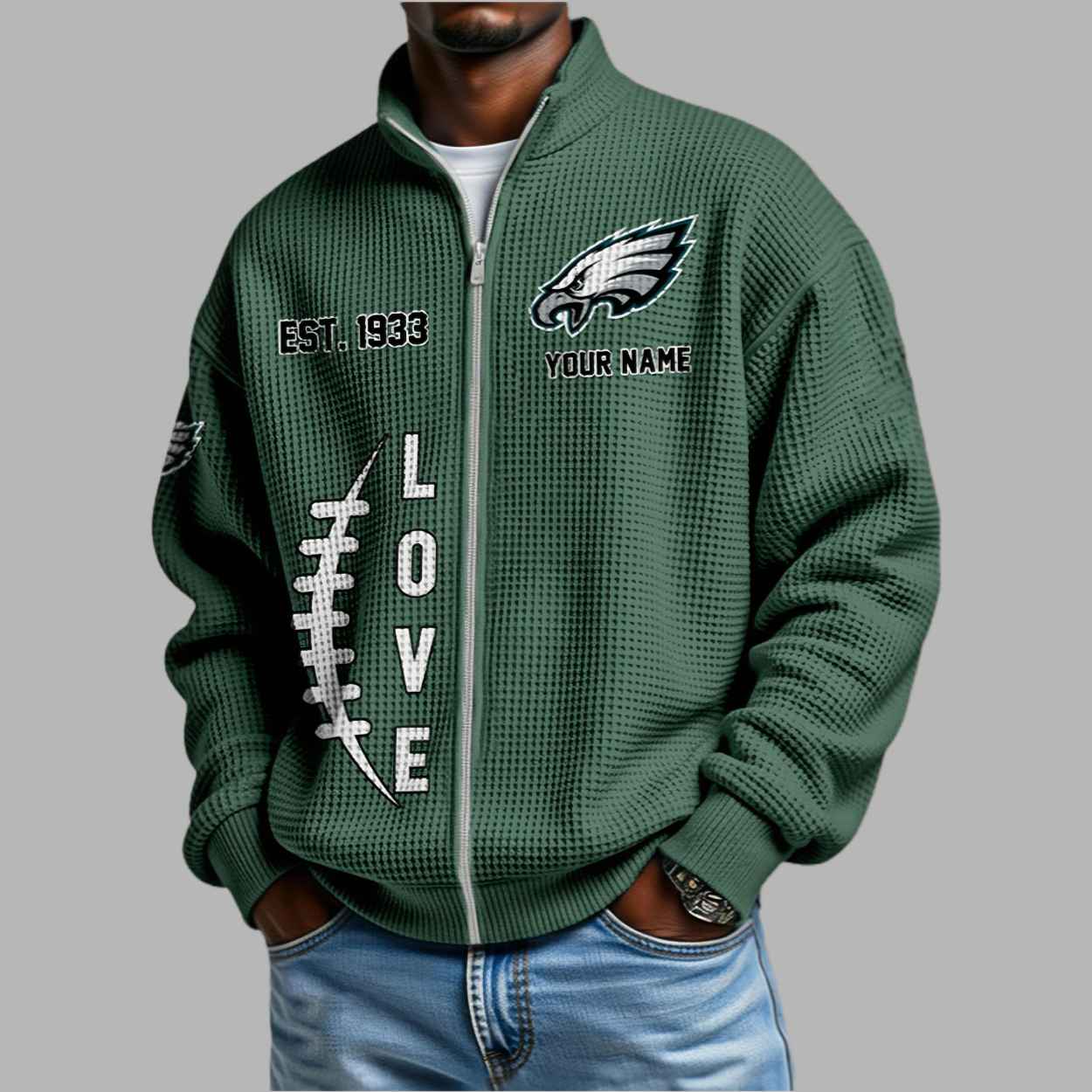 This sophisticated hunter green sweatshirt features a modern waffle-knit texture that brings a tactile, high-end feel to your fan apparel. The design is a heartfelt tribute to heritage, prominently displaying the iconic white and silver wings emblem on the chest alongside “EST. 1933” to honor the franchise’s founding year. A unique vertical “LOVE” graphic, creatively detailed with football-style stitching, runs down the front, while the sleeve is finished with additional team logos for a complete, athletic look. Beyond its sharp aesthetic, this garment represents the unyielding spirit of a community that has soared through every challenge since the team’s inaugural era. It is a creative masterpiece designed for those who value long-standing traditions and want to represent their lifelong passion with a sleek, professional silhouette that transitions perfectly from the stadium to your daily routine.