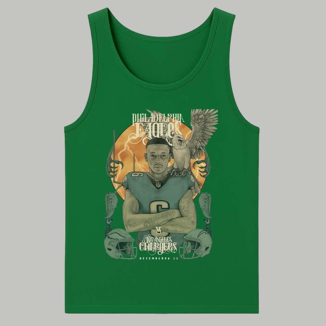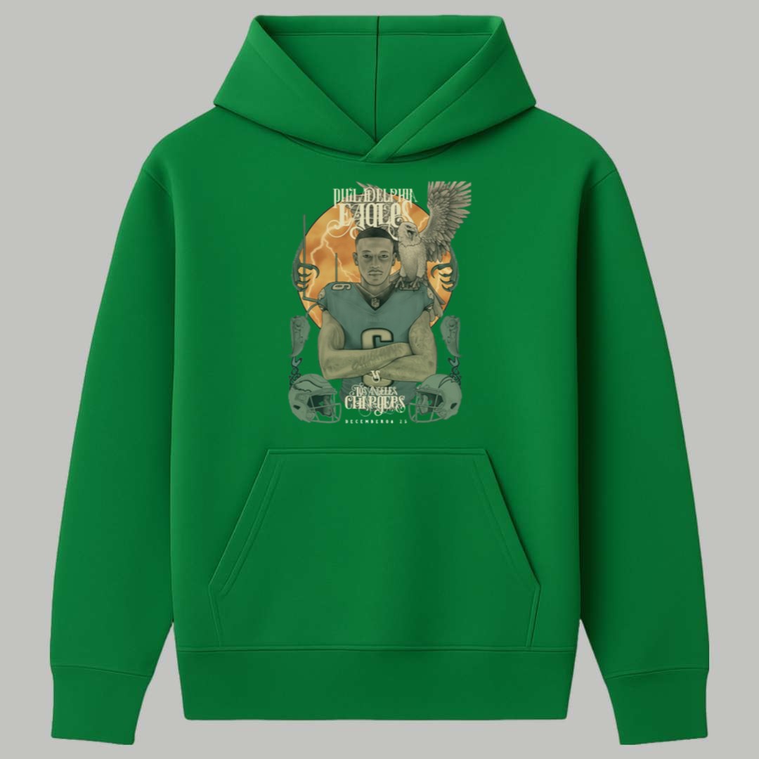 This vibrant green T-shirt is a stunning piece of fan art, capturing the intensity of the inter-conference battle scheduled for December 8, 2025. The detailed graphic centers on a dynamic player figure, flanked by an eagle perched on his shoulder, symbolizing the Philadelphia side. Below, the team names are clearly displayed: “PHILADELPHIA EAGLES” versus “LOS ANGELES CHARGERS,” along with the specific date of the encounter. This apparel serves as a unique event memento, a visual record of a highly anticipated game where two major teams clashed. It’s an imaginative and stylish way for supporters to mark their calendars, display their excitement for the competition, and celebrate the thrilling drama that is inherent in every major gridiron contest.