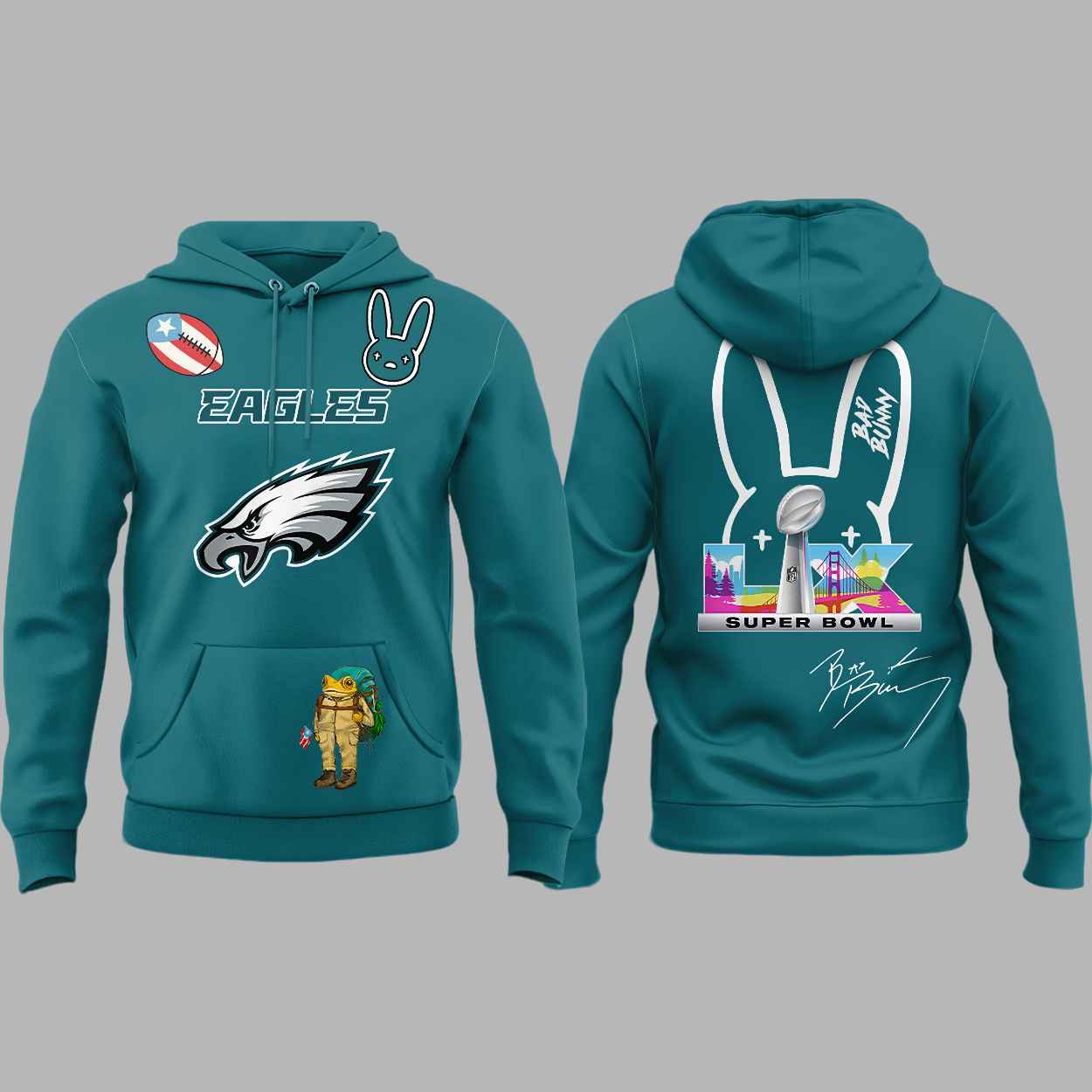 This is a premium, pullover hoodie featuring the iconic Eagles midnight green/teal color, complete with a front pouch pocket and a drawstring hood. The hoodie’s design is highly detailed on both the front and the back. The front features the official Eagles wordmark and logo alongside Bad Bunny’s famous bunny ears logo and a football patch. A whimsical detail is the small, recognizable figure of Bad Bunny near the pouch pocket, adding a unique, playful touch. The back is the centerpiece of the crossover, featuring a large outline of the bunny ears logo with the words “BAD BUNNY” integrated, framing a colorful cityscape that includes the Super Bowl logo and the Lombardi Trophy, symbolizing a championship. The entire design is anchored by a printed replica of Bad Bunny’s signature across the bottom. This hoodie commemorates the incredible cultural moment when a major franchise and a global music superstar connected, appealing to a massive, combined fanbase. The Eagles x Bad Bunny Hoodie design, particularly the inclusion of the championship theme and the artist’s signature, became instantly coveted after it was unofficially conceived by fans following Bad Bunny’s record-breaking tours and his influence on sports fashion, serving as the ultimate piece of mash-up gear that celebrates both victory and style.