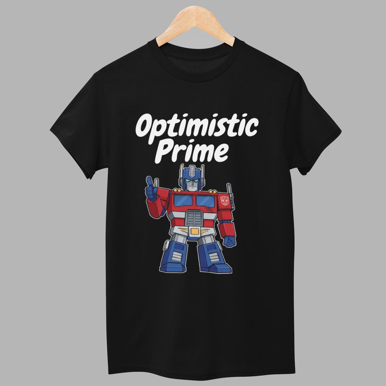 This shirt features a sharp, high-contrast graphic that merges the legendary leadership of a robotic icon with the forward-thinking philosophy of a modern tech pioneer. The design is anchored by a vibrant, stylized character in classic red and blue tones making a gesture of victory, topped with the playful yet profound “Optimistic Prime” wordmark in bold white typography. It serves as a wearable anthem for those who believe in the power of technology to solve the world’s greatest challenges, representing a mindset of relentless progress and the unwavering hope that defines the journey toward a multi-planetary future.