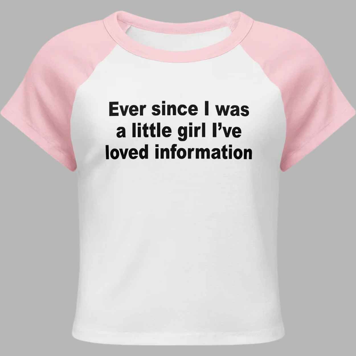 This cropped Baby Tee features a fashionable, comfortable design, blending a soft white body with contrasting pink raglan sleeves and collar. The top’s fit is both stylish and modern. The central focus is the bold, clear text printed across the chest: “Ever since I was a little girl I’ve loved information.” The simple, assertive typography allows the hilarious and instantly relatable message to take center stage. This garment is far more than just a trendy top; it embodies a confident, intellectual, and slightly satirical personality. It symbolizes a wearer who values intelligence, has an insatiable curiosity, and uses humor to express their unique brand of passion. This shirt is a clever nod to self-discovery and a fun way to celebrate the life of a dedicated learner and critical thinker.