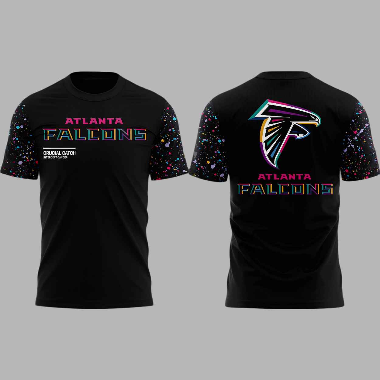 This exclusive Falcons Crucial Catch 2025 Shirt is crafted for comfort and a striking visual impact. The classic black tee is adorned with a vibrant, full-color graphic that reflects the energy of the NFL’s Crucial Catch initiative. The front proudly displays “ATLANTA FALCONS” in a dynamic, multicolor font alongside the powerful message “CRUCIAL CATCH INTERCEPT CANCER.” The back features a stylized Falcons logo outlined in neon colors, all framed by a unique paint splatter motif across the shoulders and sleeves. This shirt serves as a commemorative item for the 2025 season’s dedication to cancer awareness, allowing fans to join the Falcons in supporting early detection and risk reduction for all cancers.