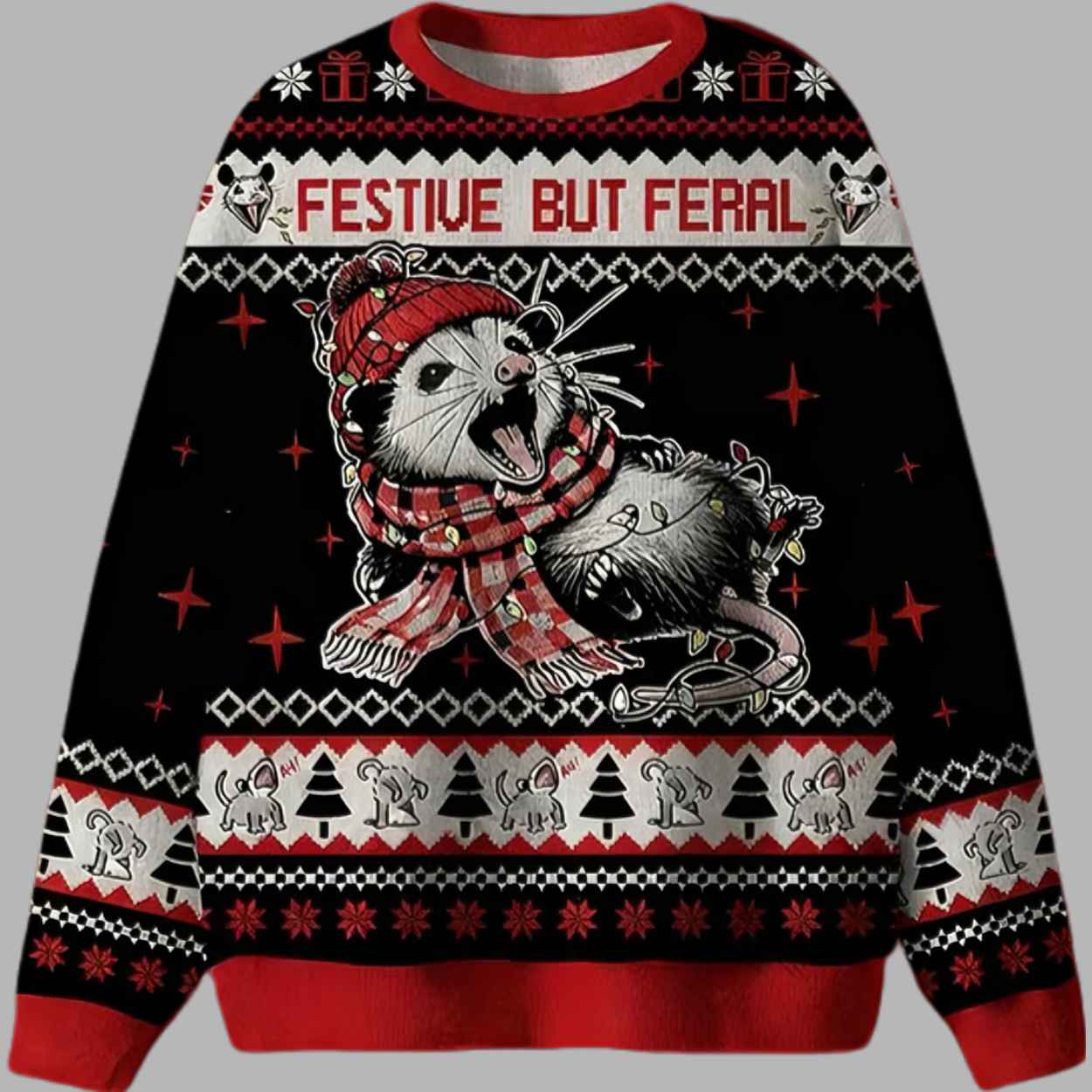 This spectacular sweater features a dominant, high-contrast palette of deep black and vibrant Christmas red, instantly setting an edgy, unconventional holiday tone. The centerpiece graphic is a brilliant, action-packed, and hilariously relatable image: a possum, the ultimate spirit animal of chaotic survival, looking absolutely feral with its mouth wide open in a scream or hiss. Yet, the creature is comically dressed in a red knit cap and a cozy plaid scarf and is tangled up in colorful Christmas string lights. Above the possum, the bold white text delivers the perfect, self-aware summary: “FESTIVE BUT FERAL”. The entire design cleverly blends this self-aware, chaotic humor with traditional “ugly Christmas sweater” motifs. The background and borders feature intricate rows of white snowflakes, geometric patterns, and repeating silhouettes of possums and Christmas trees, reinforcing the cozy, winter knit aesthetic. The juxtaposition of the cozy, traditional look and the fierce, chaotic animal is what makes the sweater so uniquely funny. This sweater is far more than a simple novelty item; it’s a brilliant piece of visual comedy that validates the universal feeling of holiday stress and the intense, often-absurd pressure to be cheerful. It transforms the struggle to remain composed into a shared, celebrated joke, suggesting that owning your chaos is the key to true festive fun. It appeals to the wearer who possesses a sharp, self-aware sense of humor and uses irony to cope, making it a comfortable, spirited, and immediate symbol of relatable resilience.