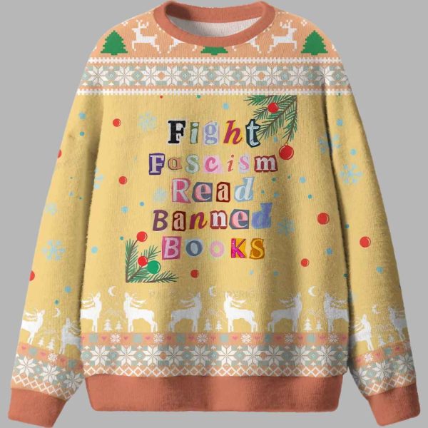 This sweater is a brilliantly subversive piece of holiday apparel, taking the cozy aesthetic of the “ugly Christmas sweater” and turning it into a bold declaration of civic and literary principles. The background is a warm, festive yellow or beige, providing a cheerful contrast to the serious message. The borders and sleeves are adorned with classic, whimsical holiday patterns, including snow-white reindeer, green Christmas trees, and intricate snowflakes, giving it that familiar, cozy charm. The central, impactful message is displayed prominently: “Fight Fascism Read Banned Books.” The words are rendered in a charmingly mismatched, block-letter style with varying festive colors, making the strong statement accessible and visually engaging. Accents like holly and Christmas balls frame the text, further underscoring the contrast between the cozy holiday setting and the critical message. This garment is far more than just cold-weather wear; it embodies the spirit of intellectual freedom, defiance, and the power of literature to challenge and change the world. Wearing this sweater is a proud declaration that you value knowledge, open discourse, and the right to read, making it a highly meaningful and memorable statement piece for any gathering.