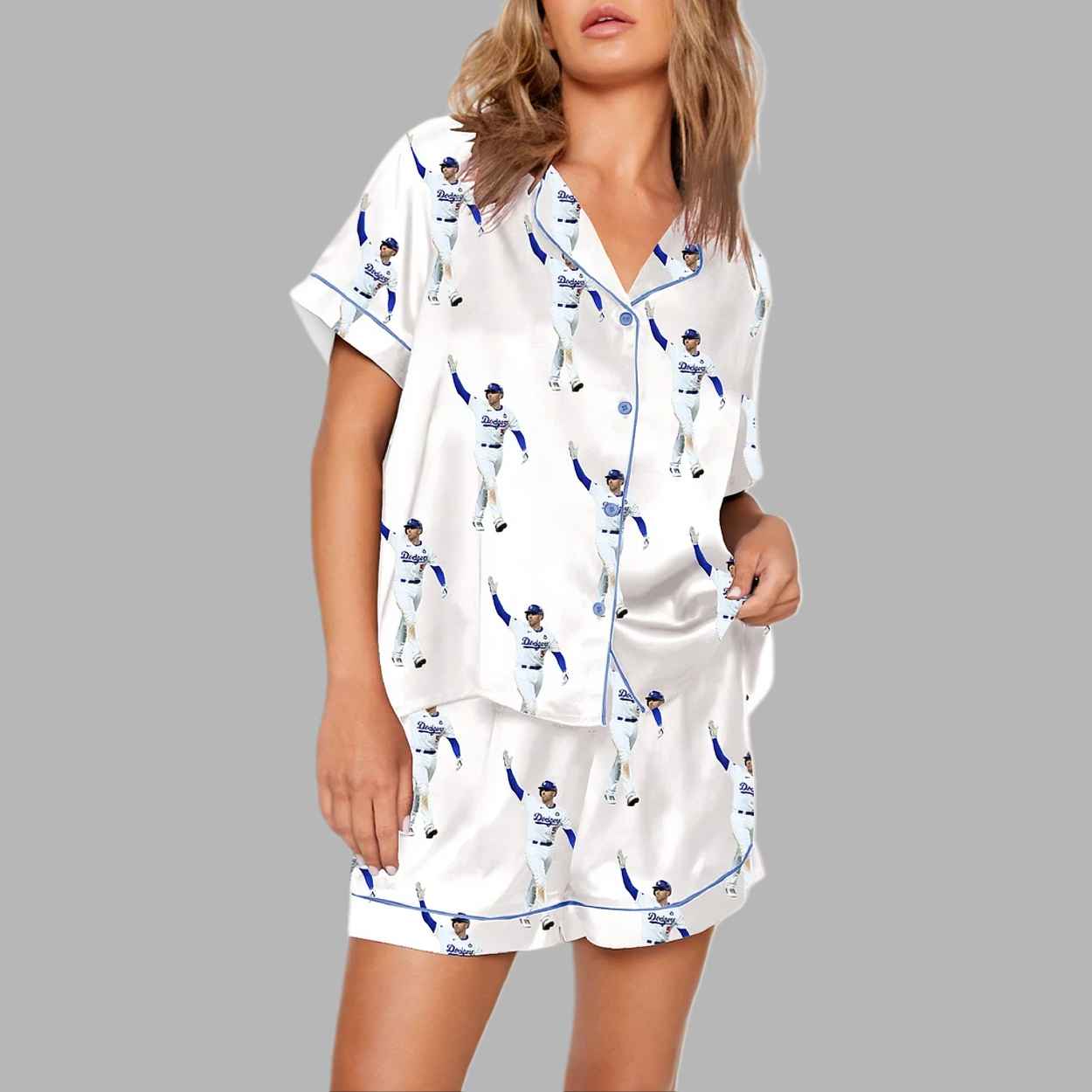 The “Freddie Freeman Pajama Set” is a chic, comfortable two-piece sleepwear ensemble that transforms into a visual tribute to the star player. The crisp white fabric is covered in a clean, repeating pattern featuring stylized illustrations of the player in his full uniform, captured in a dynamic, high-energy pose—waving to the crowd or celebrating a big hit. The consistent, all-over imagery of the player in motion gives the set a spirited, celebratory feel. This detailed, player-centric pattern is a sophisticated, fan-focused nod to the star’s charismatic presence and leadership on the field. It elevates casual sleepwear into a statement of intimate fandom, allowing the wearer to feel personally connected to the excellence and enthusiasm the player brings to every game. It embodies the hope and high expectations of the fan base, wrapping the wearer in the confident energy of a star athlete. The short-sleeve button-down top and matching shorts are neatly trimmed with contrasting blue piping, offering a cool, light, and comfortable fit that makes this set the ideal gear for both restful sleep and excited, game-day lounging.