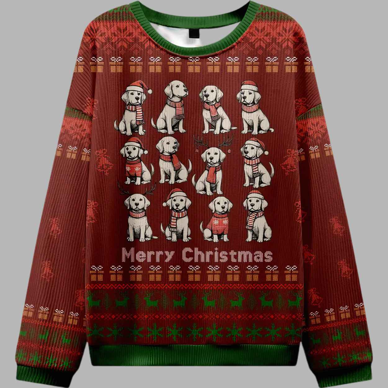 This cozy, crew-neck sweater uses a rich, festive maroon/red background, beautifully contrasted with bright green trim on the collar and cuffs. The entire garment is covered in dense, traditional ugly sweater Fair Isle patterns, featuring festive icons like wrapped gifts, tiny snowflakes, and repeating silhouettes of reindeer and geometric patterns in red, green, and gold, creating a perfectly warm and festive backdrop. The central graphic is a grid of twelve incredibly charming puppies (appearing to be Golden Retrievers or Labradors). Each dog is dressed in a different combination of holiday accessories, including Santa hats, striped scarves, and even a pair of playful reindeer antlers. The dogs have sweet, expressive faces that capture the innocence and joy of the holiday season. The message “Merry Christmas” is prominently displayed below the dogs, finalizing the celebratory theme. The detail and variation among the twelve pups make this design visually engaging and endlessly delightful.