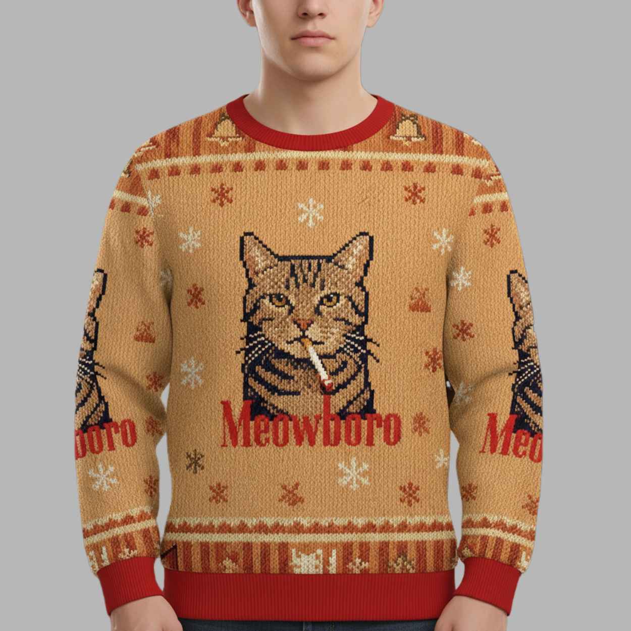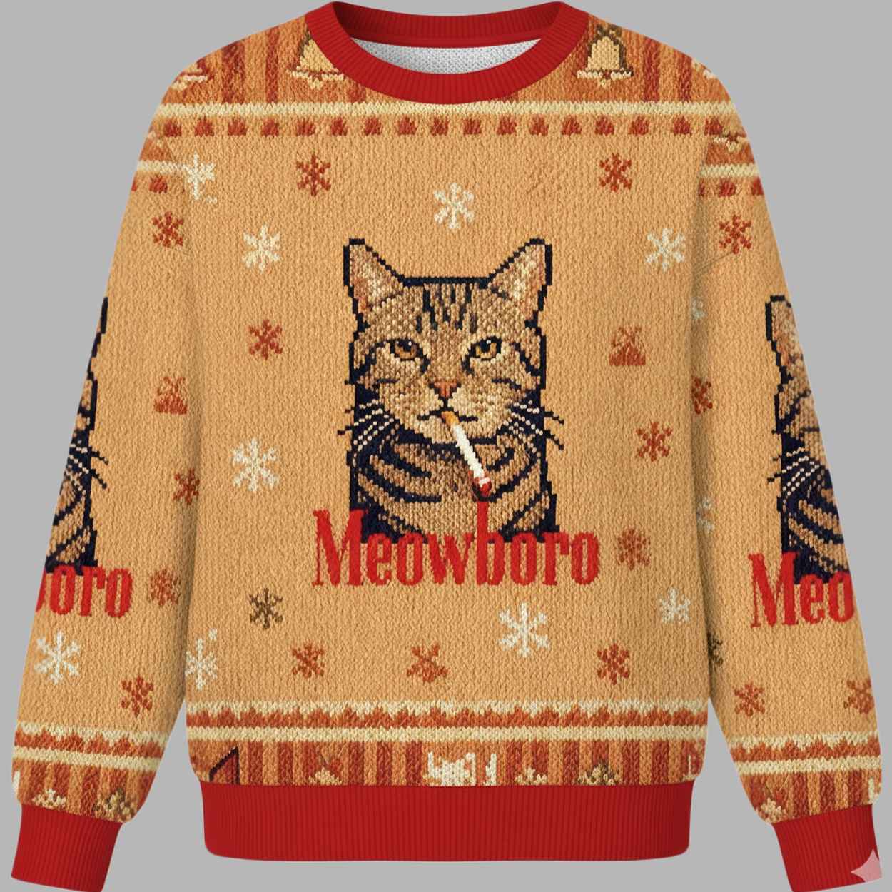 This eye-catching sweater features a warm, comforting beige and orange knit base, framed by classic, rustic fair isle patterns incorporating snowflakes, bells, and starbursts, giving it a classic, cozy winter look. The centerpiece is a highly realistic, stylized portrait of a tabby cat, looking directly outward with a confident gaze while holding a cigarette delicately in its mouth. Below the cat, the text is a brilliant, pun-based adaptation of a famous advertising slogan: “Meowboro.” This design is a brilliant piece of pop culture nostalgia, irony, and cheeky humor. It takes a recognized, rugged, vintage advertisement and replaces the human figure with a cool, unbothered cat, transforming the serious image into an absurd, instantly funny meme. Wearing this piece signals a sharp, witty sense of humor, an appreciation for throwback advertising aesthetics, and a willingness to subvert expectations with a comfortable, cozy garment. It’s the perfect way to make a bold, unforgettable statement that is both pop-culture savvy and utterly hilarious.