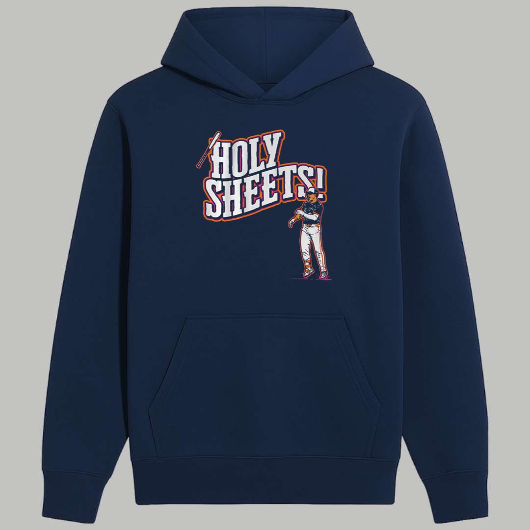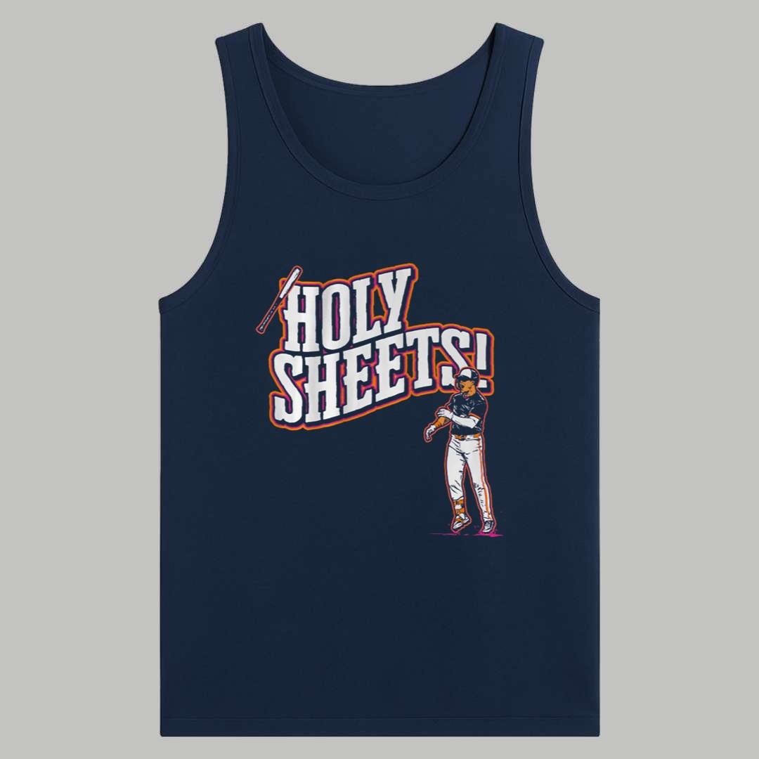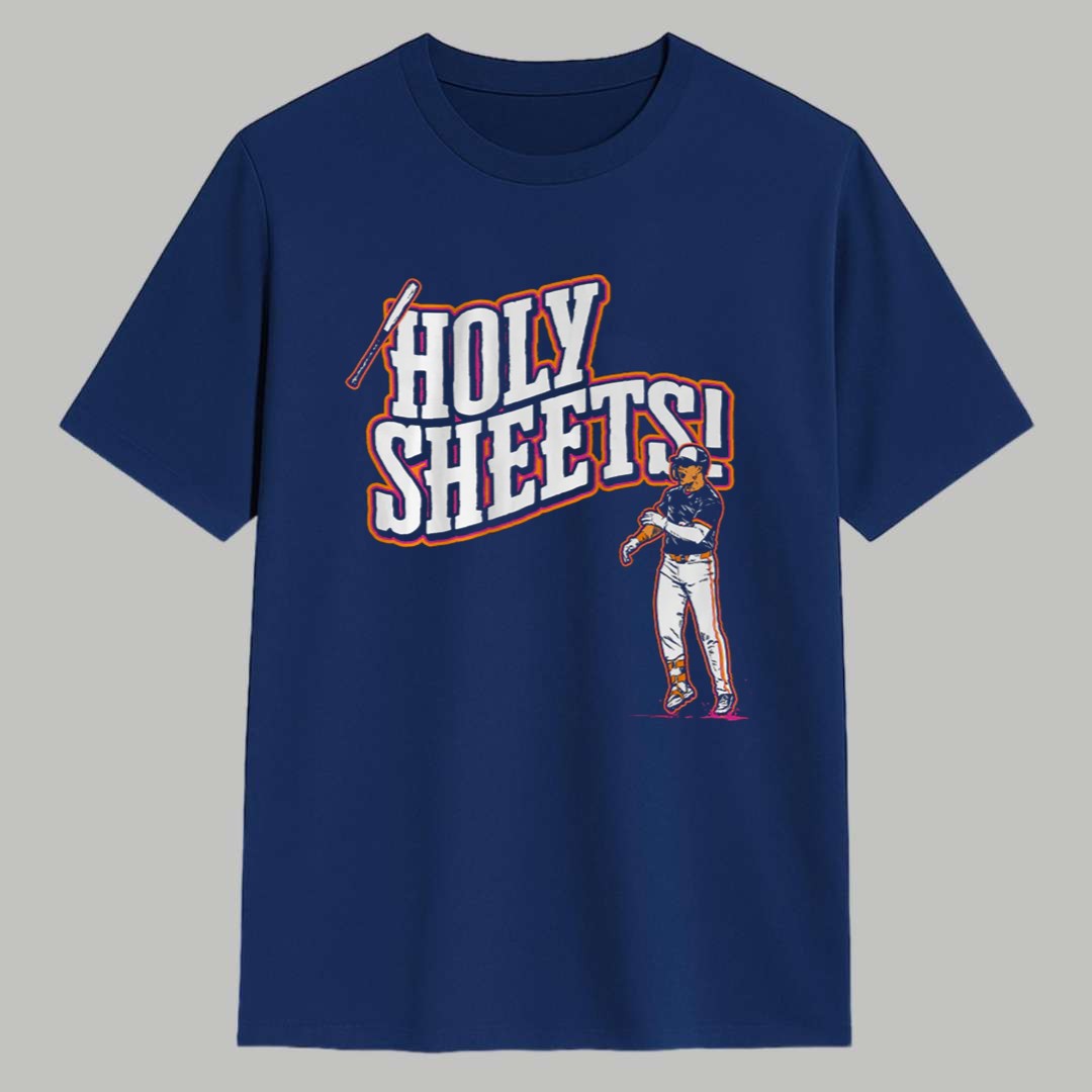 Standard player shirts focus on the stats, but this “Holy Sheets” edition focuses on the feeling of a game-changing play. It’s a witty and stylish way to show your loyalty to one of the team’s most exciting power hitters. The pun-based humor combined with a high-quality action graphic makes it a standout piece that fellow fans will instantly recognize and appreciate. Whether you’re in the bleachers or at a local sports bar, this shirt is the ultimate conversation starter for anyone who bleeds the team colors and loves a good walk-off celebration.