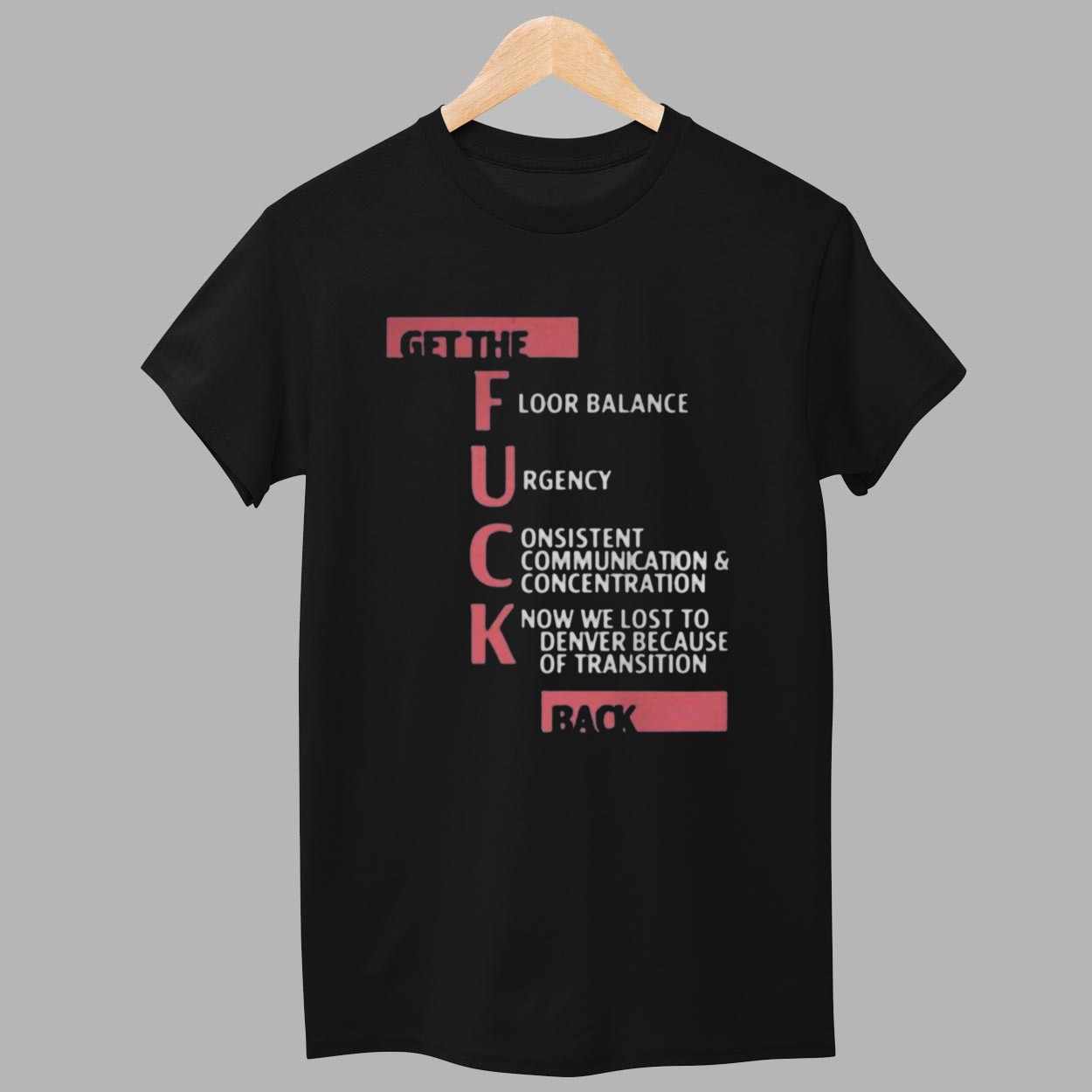 Don’t miss the opportunity to own this iconic and truly unique piece of fan gear. The Get The Fuck Floor balance Urgency Consistent Communication And Concentration Know We Lost To Denver Because Of Transition Back Shirt is the perfect blend of comfort, bold style, and a profound, humorous message. It allows you to proudly display your love for your team and your unwavering belief in their potential for a quick turnaround. Get yours today and wear your convictions with a smile.