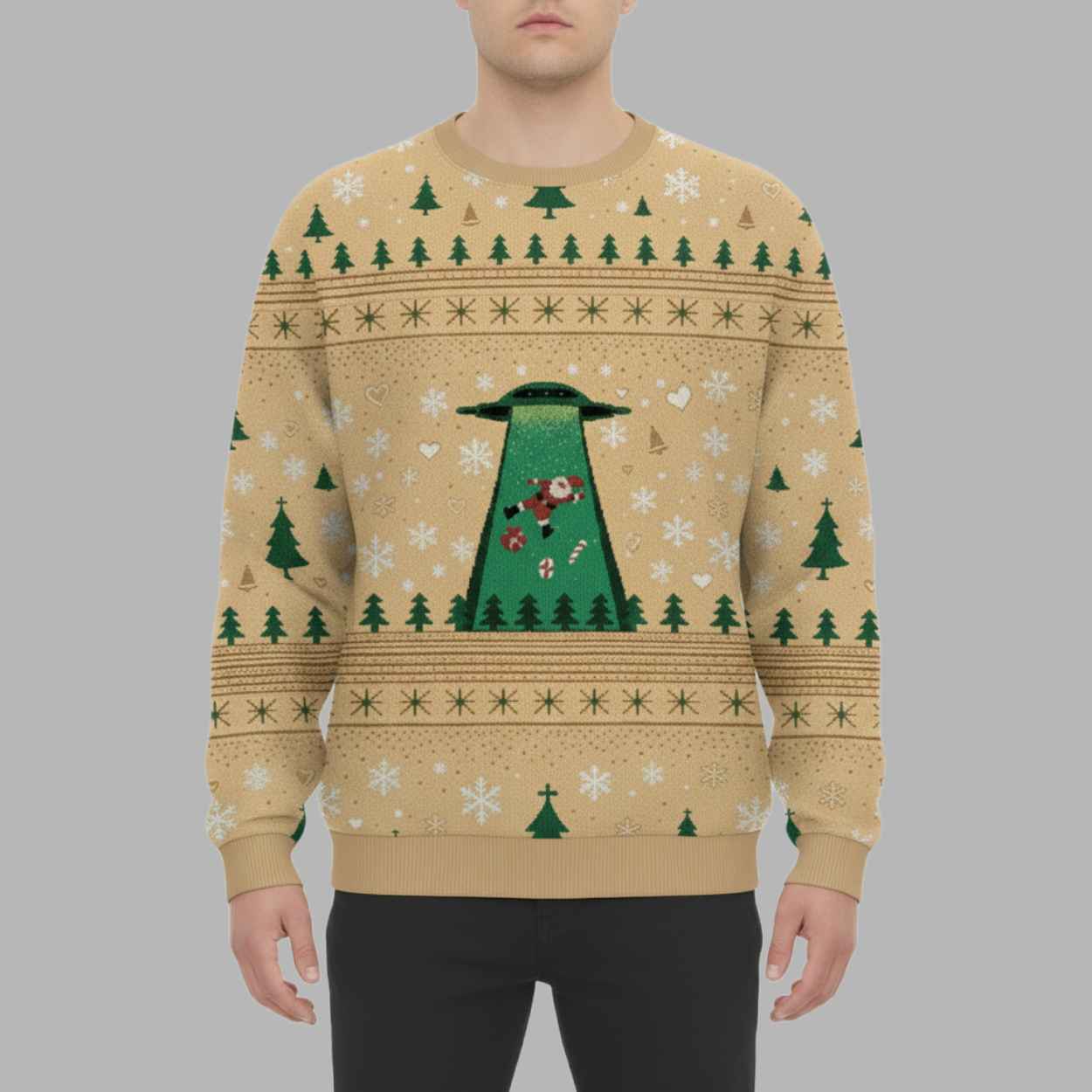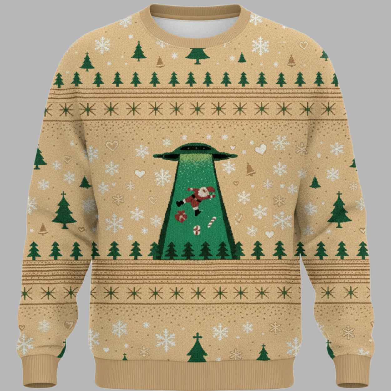 This spectacular sweater features a soft, inviting beige background, reminiscent of a cozy, dusty knit, perfectly contrasted by traditional Christmas colors of red, green, and white. The centerpiece graphic is a brilliant, absurd, and action-packed scene: a classic flying saucer/UFO is hovering over a patch of evergreen trees, emitting a bright green tractor beam. Caught in the beam, in mid-ascent, is Santa Claus himself, who is being abducted by the aliens, dropping a few candy canes and gifts in the process. This image answers the question of how Santa travels, with a hilarious, unexpected twist. The entire design cleverly blends this sci-fi humor with traditional “ugly Christmas sweater” motifs. The background and borders feature intricate rows of green Christmas trees, white snowflakes, hearts, and geometric patterns, reinforcing the cozy, winter knit aesthetic while the alien abduction takes center stage. The juxtaposition of the cozy, traditional look and the shocking, sci-fi chaos is what makes the sweater so uniquely funny. This sweater is far more than a simple novelty item; it’s a brilliant piece of visual comedy that subverts the often-saccharine holiday narrative, suggesting that the spirit of Christmas may, in fact, be governed by forces from beyond our planet. It appeals to the wearer who possesses a sharp, self-aware sense of humor and uses irony to navigate the season, transforming a common holiday figure into a comfortable, chaotic symbol of festive absurdity.
