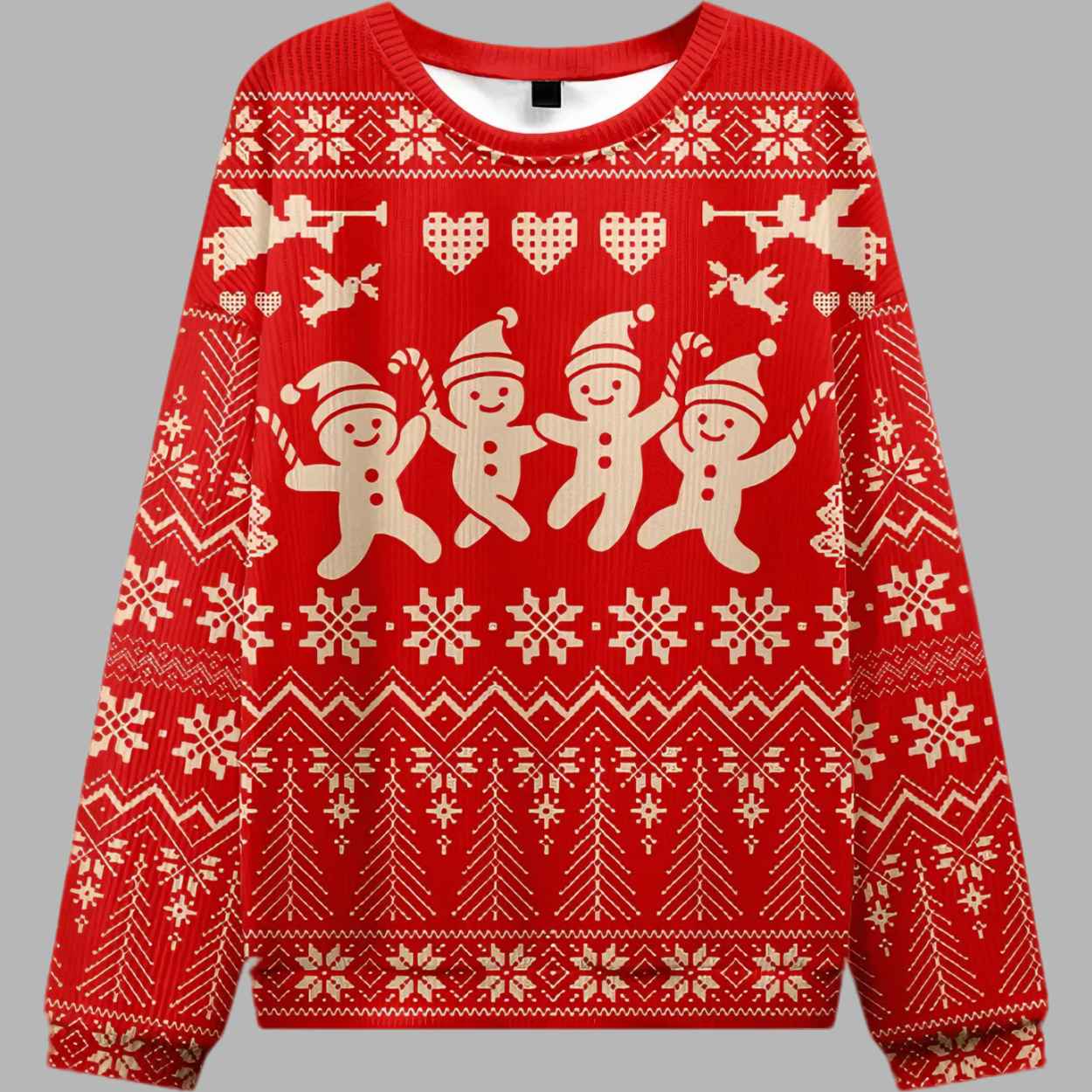 This vibrant red and white sweater is a charming tribute to classic holiday iconography. The design features traditional “ugly Christmas sweater” patterns, including snowflakes, geometric motifs, angels blowing horns, and sweet little hearts. The central focus is a line of four happy, cute gingerbread men, each wearing a Santa hat and holding a candy cane, dancing hand-in-hand in pure, uninhibited joy.