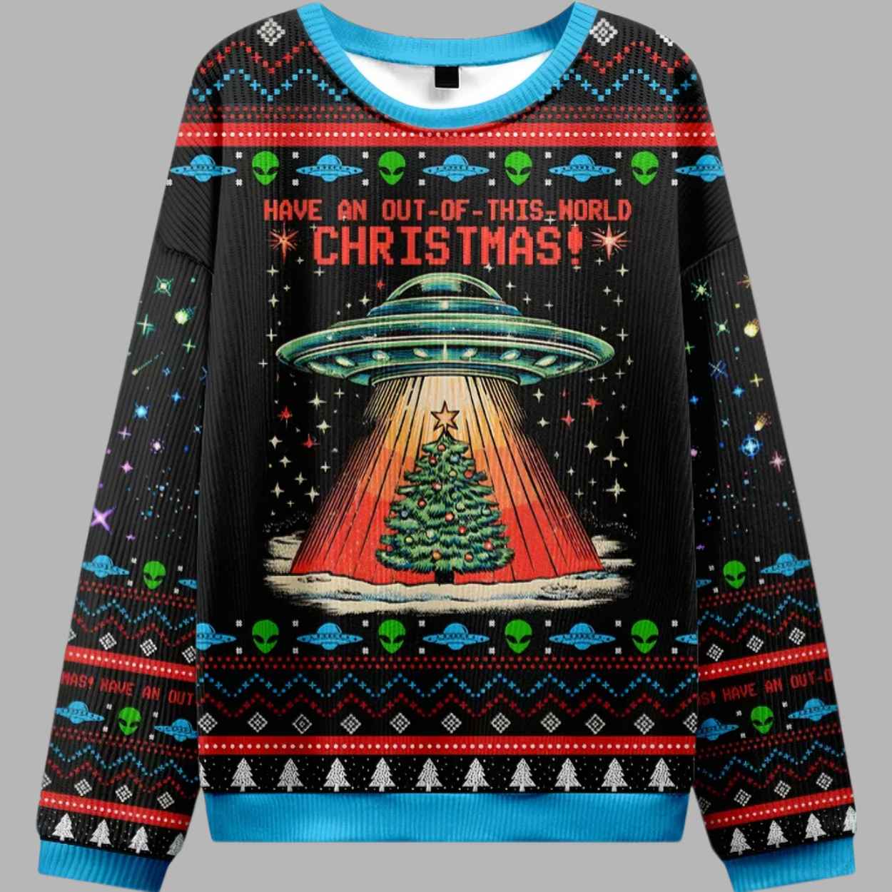 This bold, black sweater features vibrant, electric blue trim and dramatic fair isle patterns adorned with tiny UFOs, classic green alien heads, stars, and snowflakes, creating a chaotic, cool, and festive look. The centerpiece is a stunning visual: a classic flying saucer hovering over a snowy landscape, beaming up a fully decorated Christmas Tree with a powerful, glowing red light beam. Above the scene is the perfectly thematic greeting: “HAVE AN OUT-OF-THIS-WORLD CHRISTMAS!” This sweater’s meaning is a delightful collision of pop culture, humor, and a rejection of the ordinary. It represents the fun of finding the extraordinary in the traditional, suggesting that even the biggest holiday traditions could use a little extraterrestrial intervention. Wearing this piece signals a playful, imaginative personality, an appreciation for quirky sci-fi themes, and a readiness to make a truly unique and memorable statement. It’s the perfect way to make your holiday attire truly unconventional and fun.