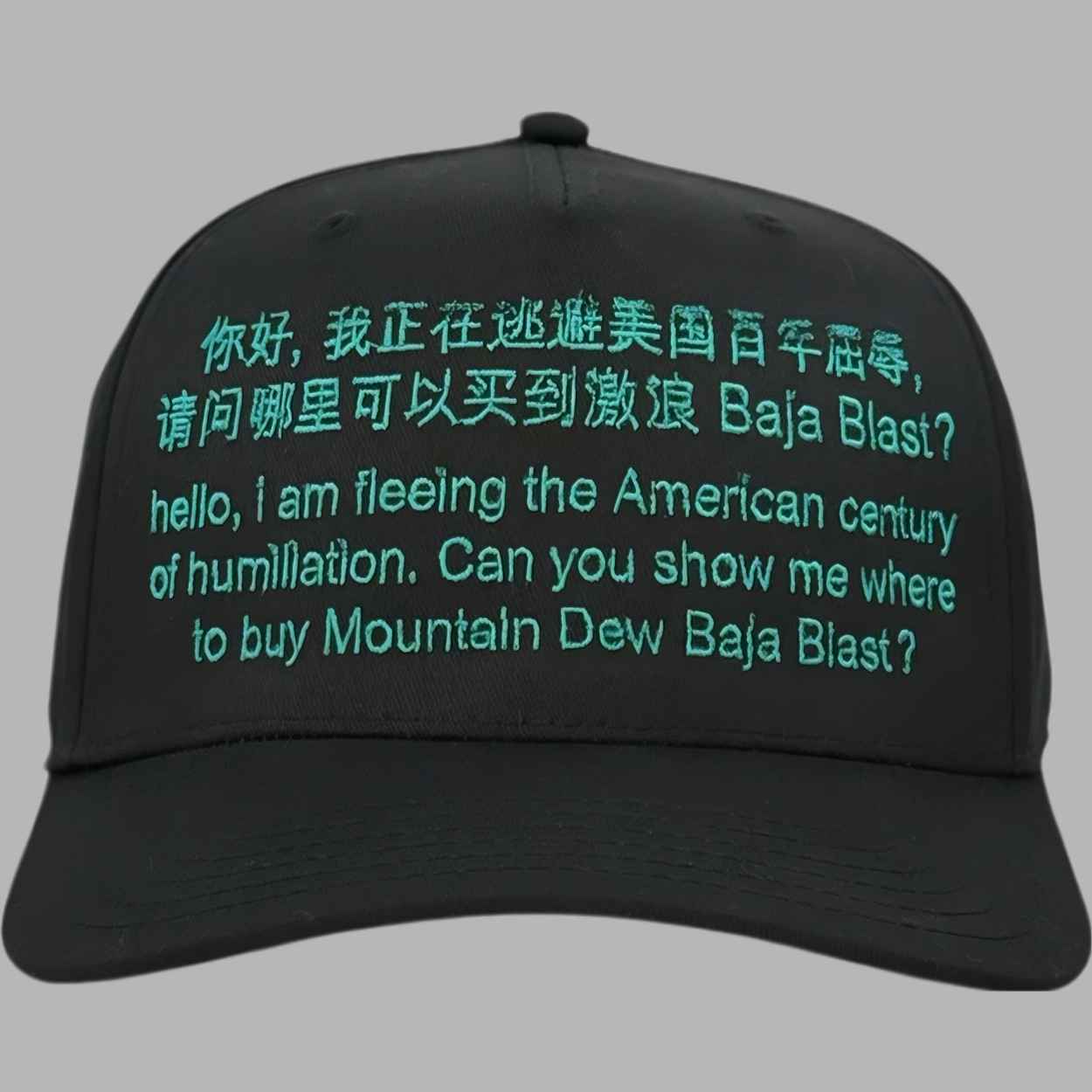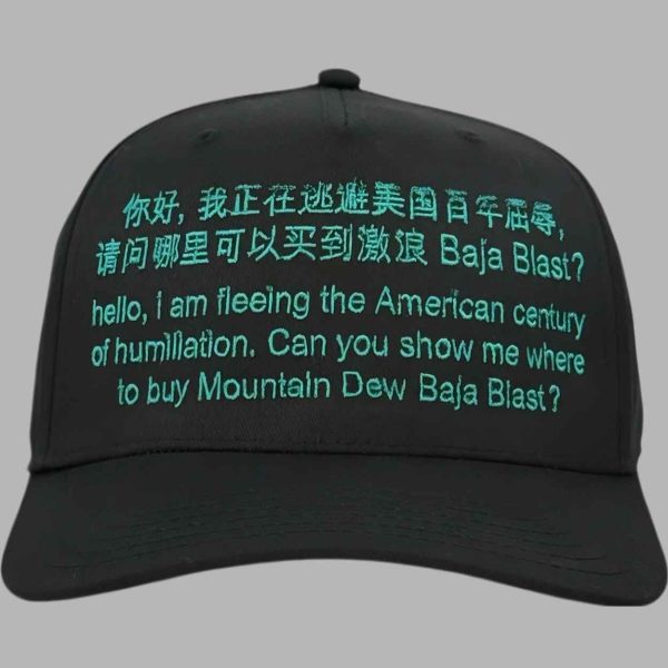 This exceptionally unique and unforgettable hat is a high-impact statement piece designed for those who appreciate dark humor, social critique, and internet irony. The cap features a sleek black base and is emblazoned across the front with the multi-line, self-aware text in both English and Chinese: “hello, i am fleeing the American century of humiliation. Can you show me where to buy Mountain Dew Baja Blast?” The profound, geopolitical sentiment of the first line is hilariously undercut by the extremely specific, mundane, and consumerist request for the popular soft drink in the second. This garment is far more than just a cap; it’s a wearable symbol of surreal cultural mashups, commentary on global power shifts, and the comforting absurdity of pop culture escapism. It’s an ideal way to showcase your witty, unique personality and inject some unforgettable, laugh-out-loud charm into any casual outing, instantly signaling your complex and very specific sense of humor.